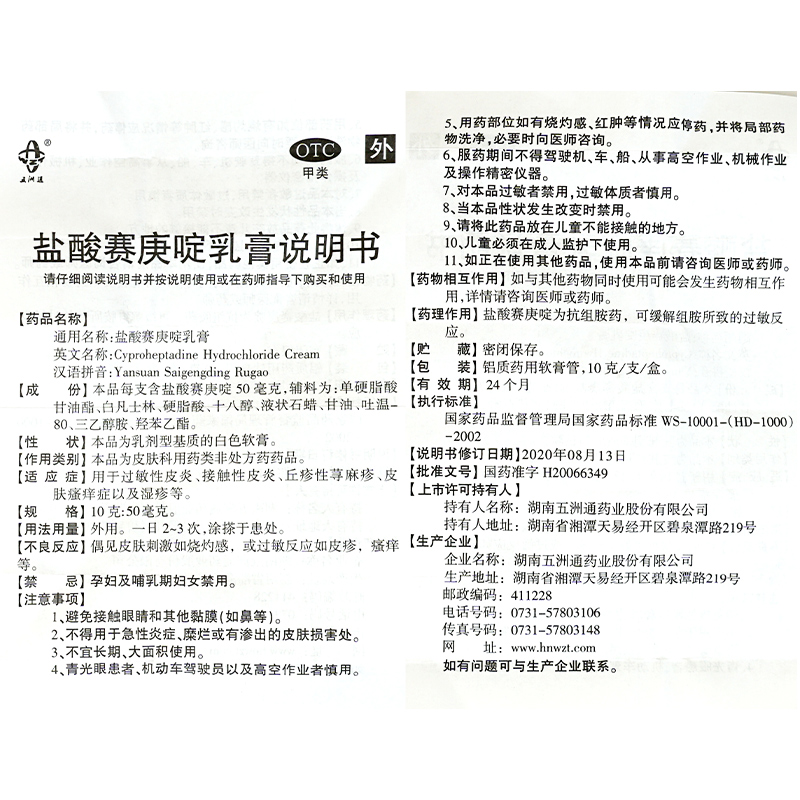 五洲通盐酸赛庚啶乳膏10g湿疹荨麻疹药膏皮炎皮肤瘙痒过敏非片