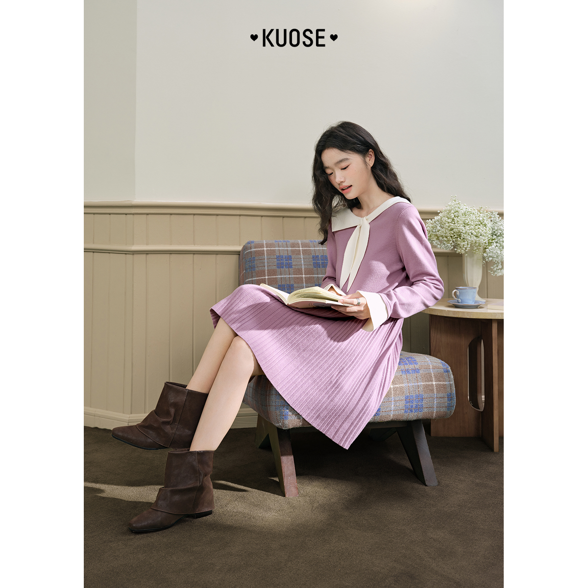 阔色紫色甜美针织连衣裙短裙女2025秋冬季新款气质收腰长袖小黑裙