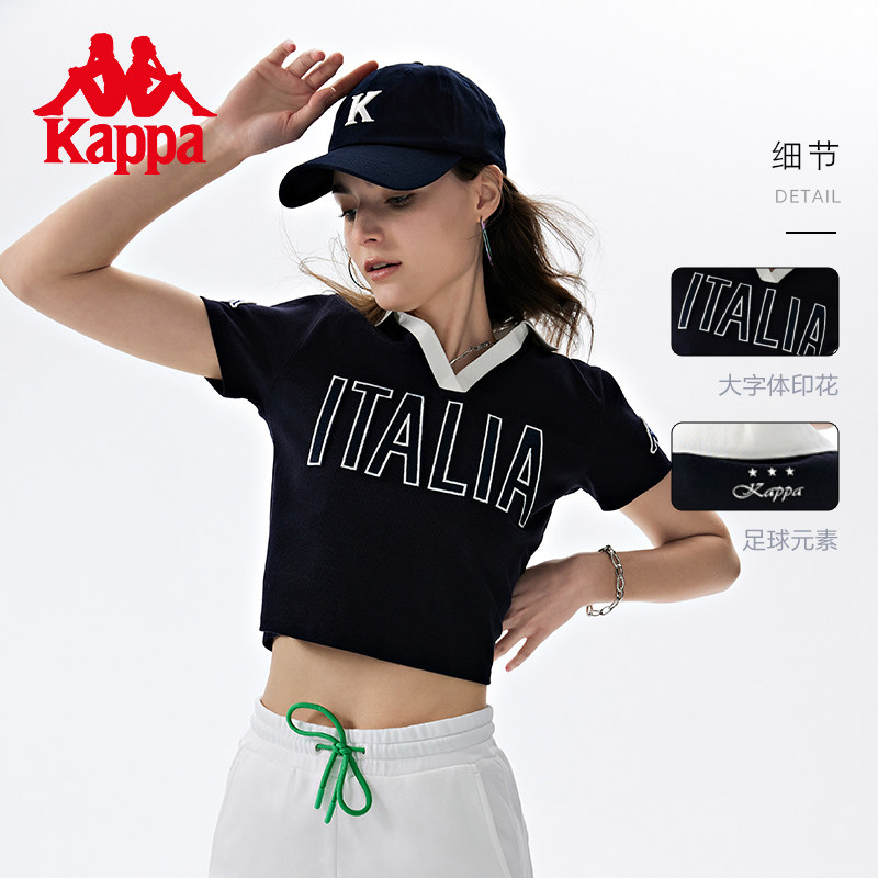 卡帕Kappa复古运动POLO衫新款女短露脐运动T恤休闲V领半袖夏