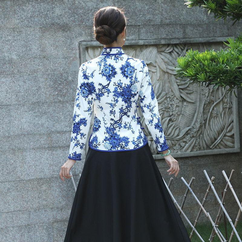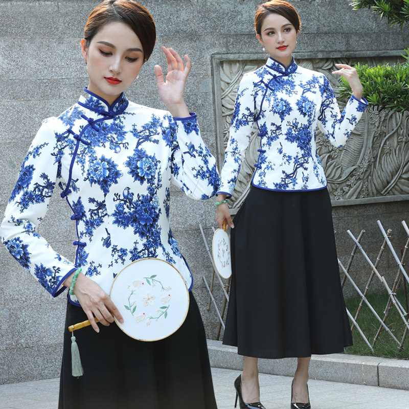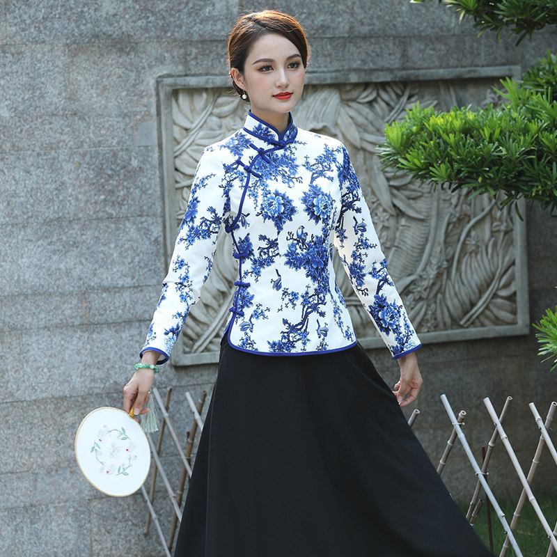 玫娅娣2021斜襟长袖复古青花瓷民族风旗袍女唐装日常上衣短旗袍