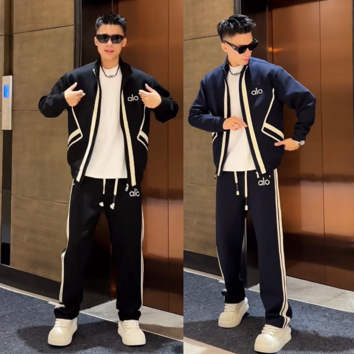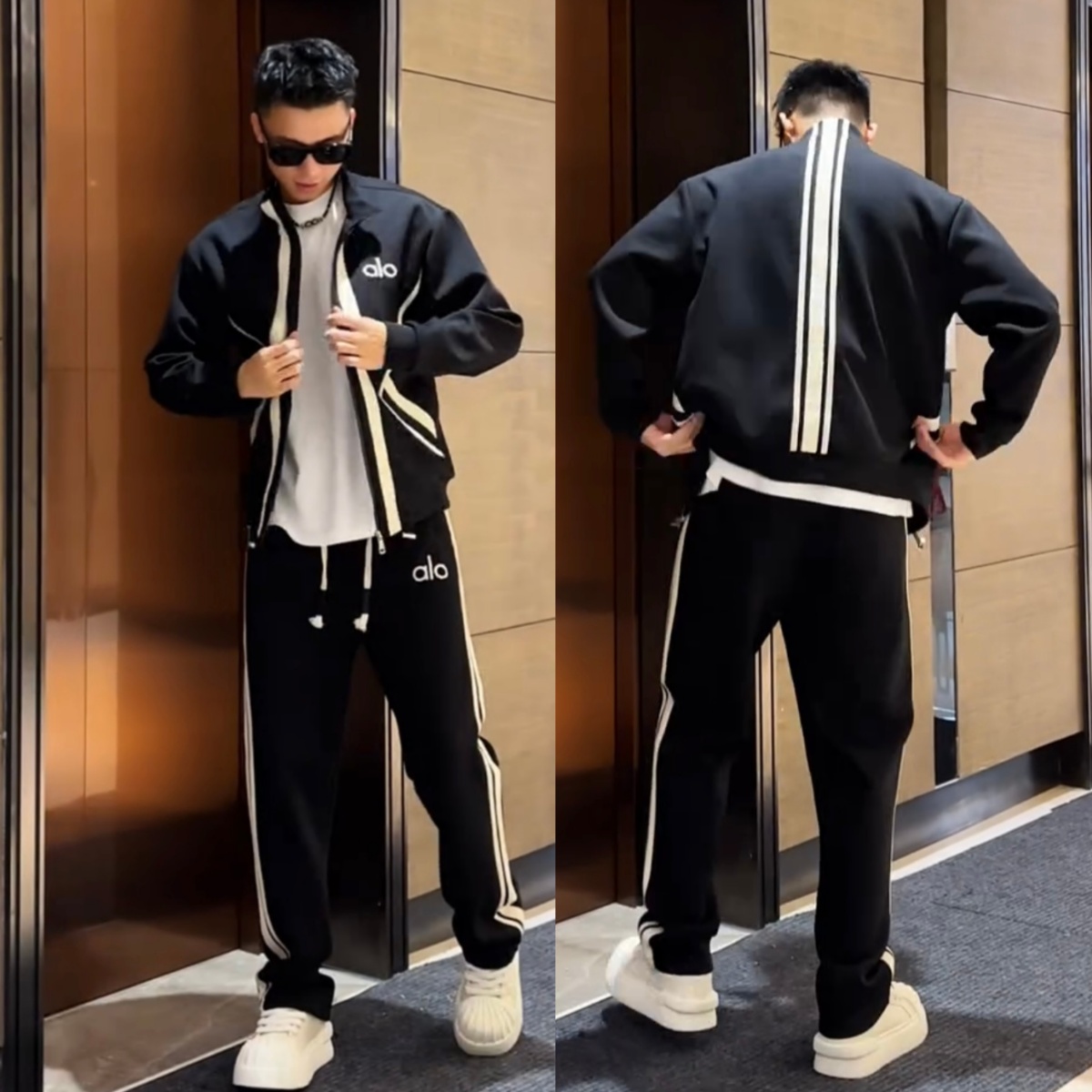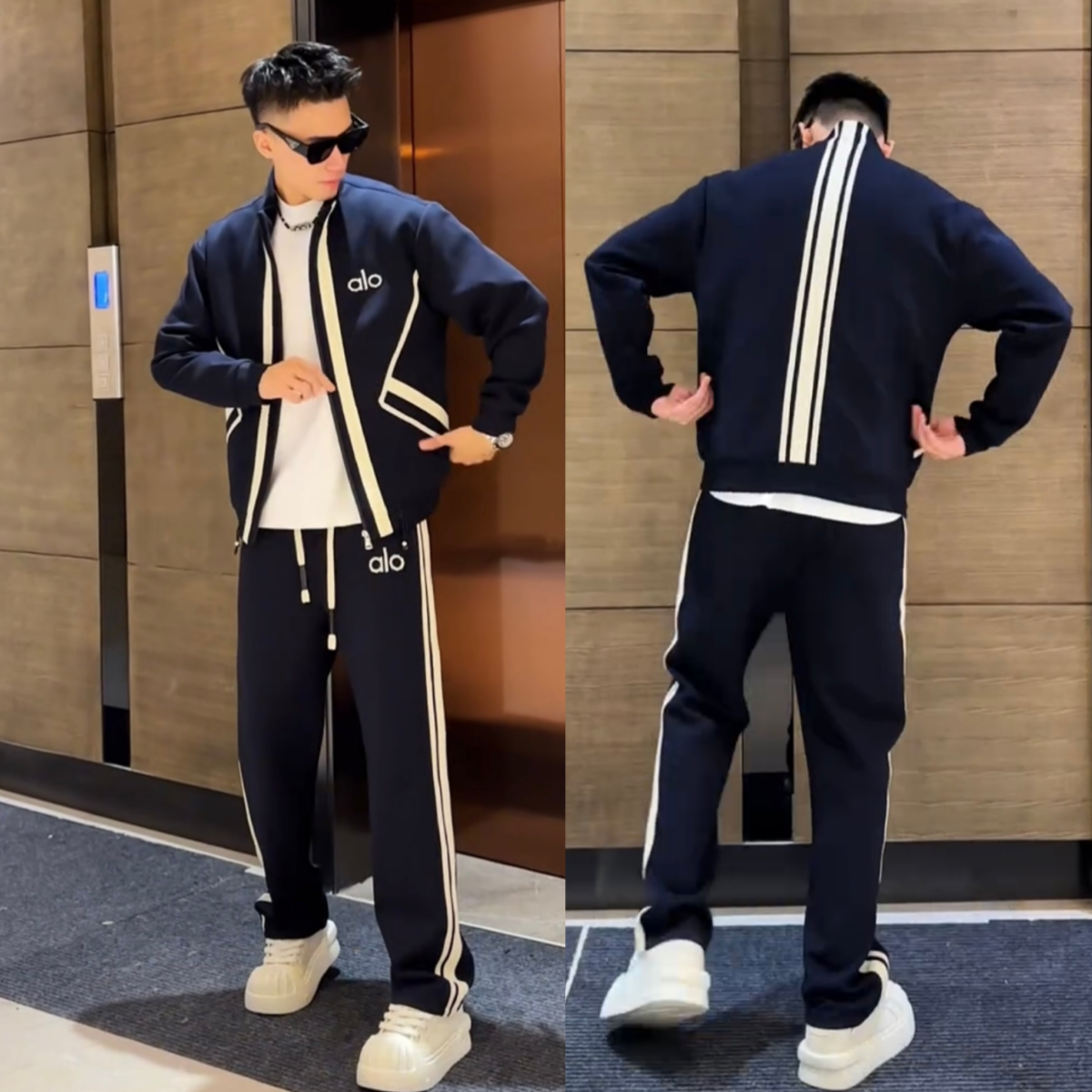 秋冬季潮牌轻奢空气层休闲运动套装字母刺绣条纹拼接夹克外套长裤