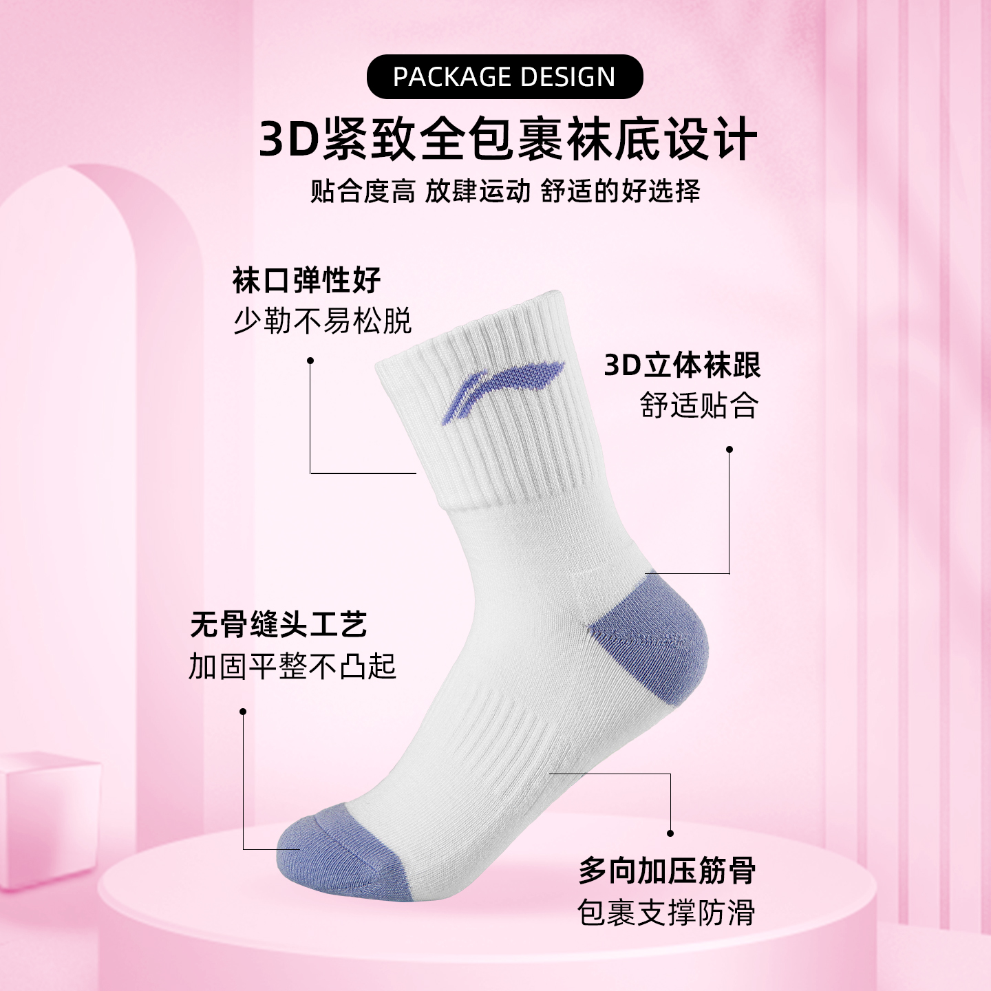 李宁女子跑步中筒袜专业舒适抑菌