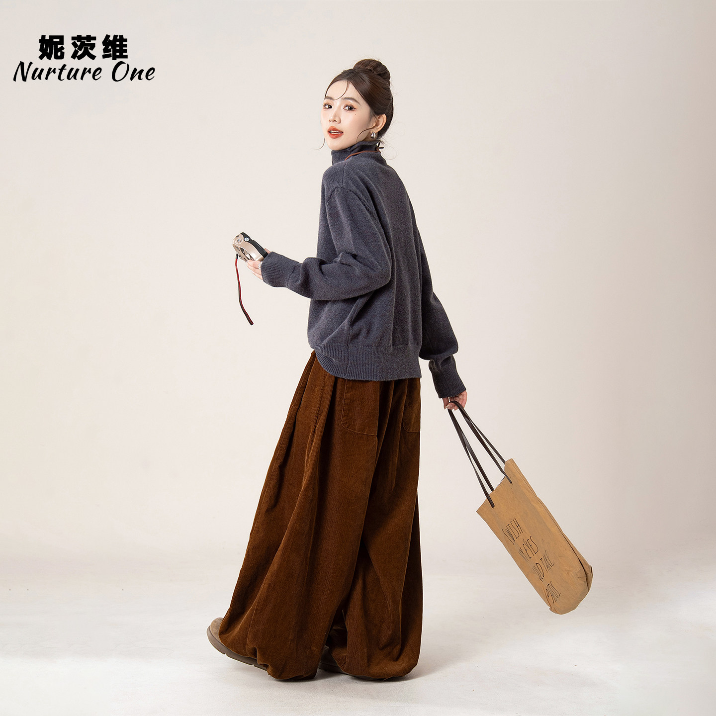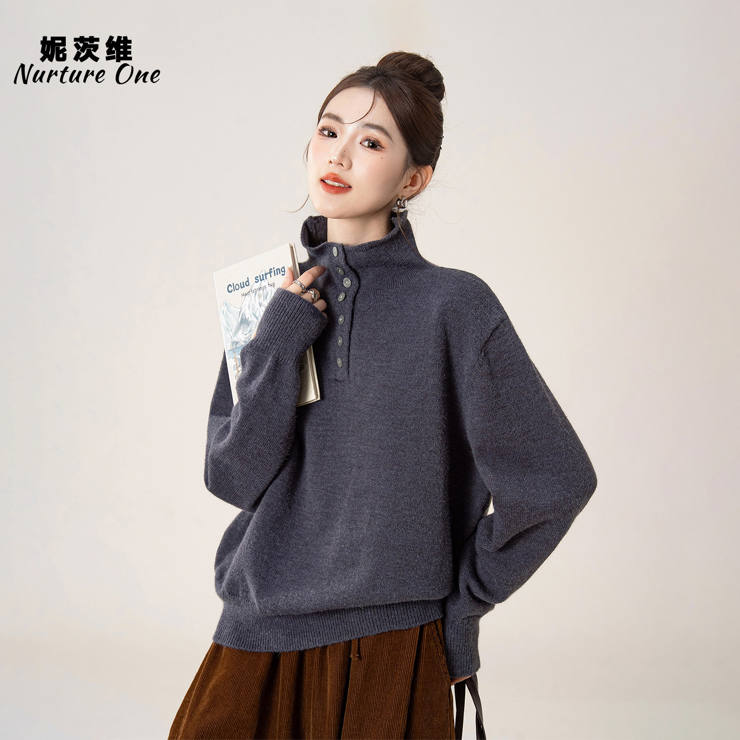 灰色慵懒松弛感高领纽扣针织毛衣