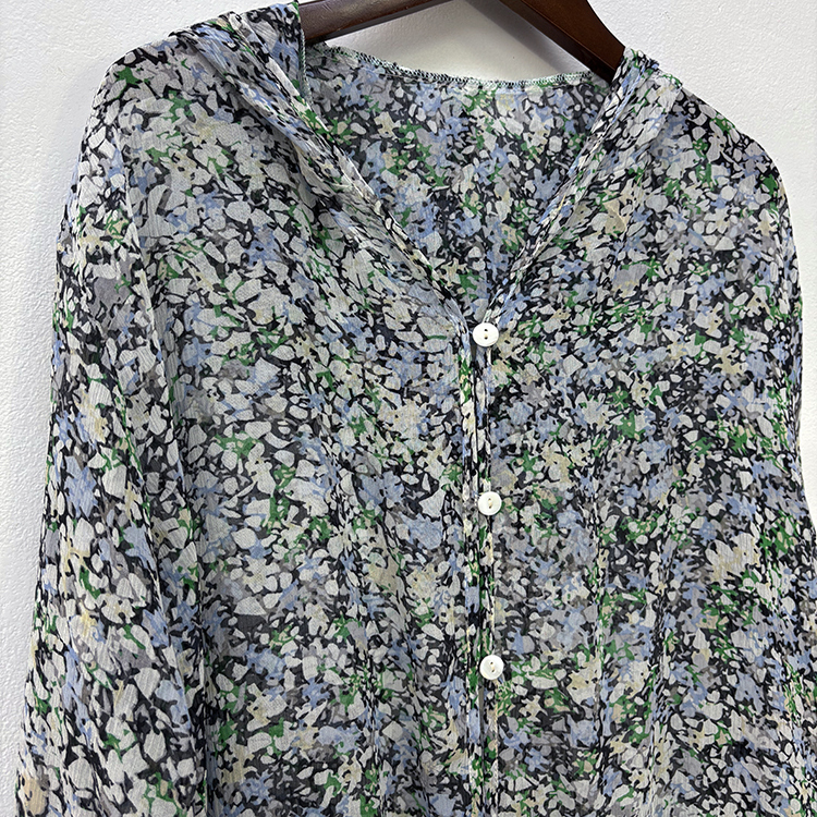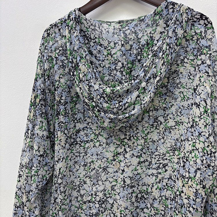 真丝顺纡绉印花长袖连帽衫防晒衣