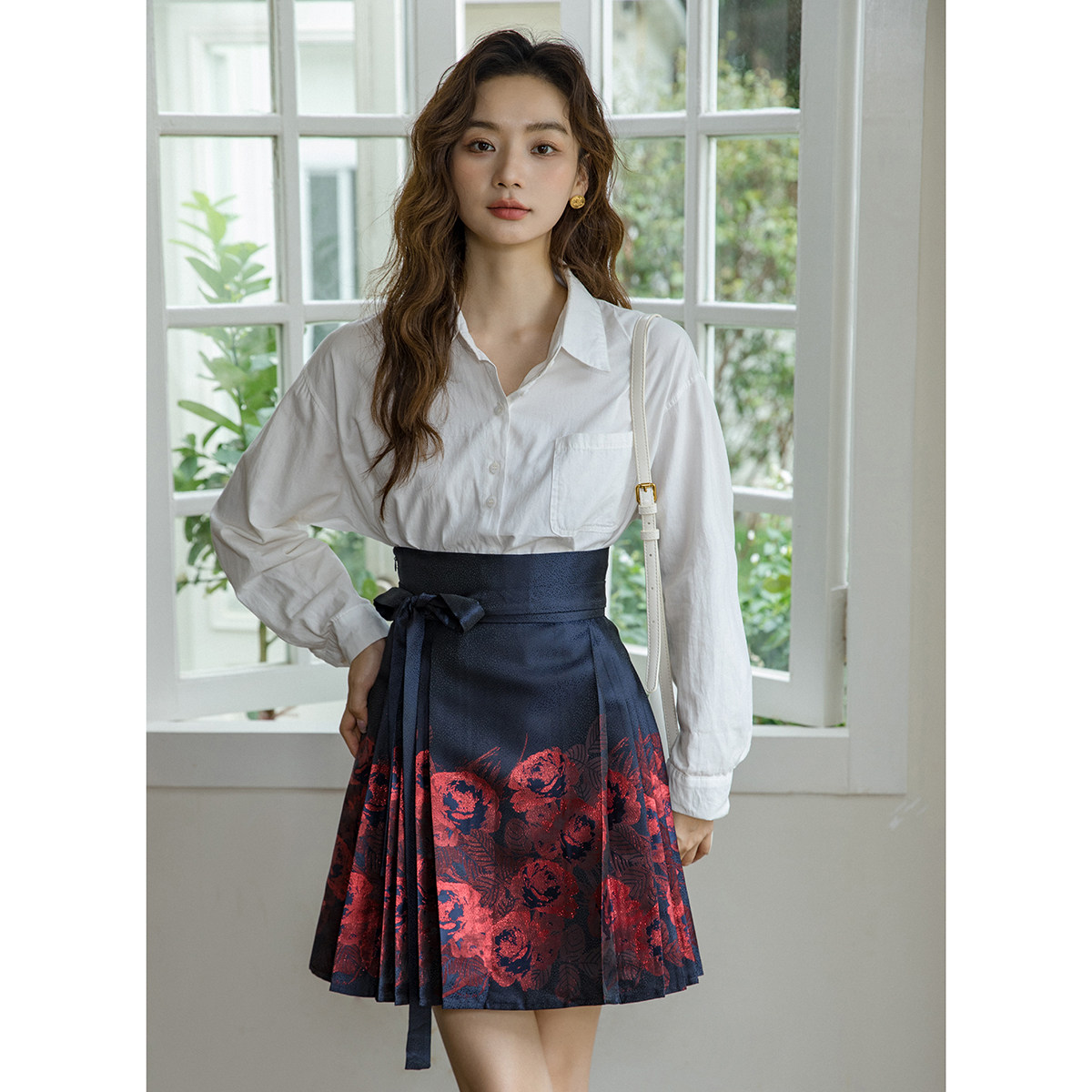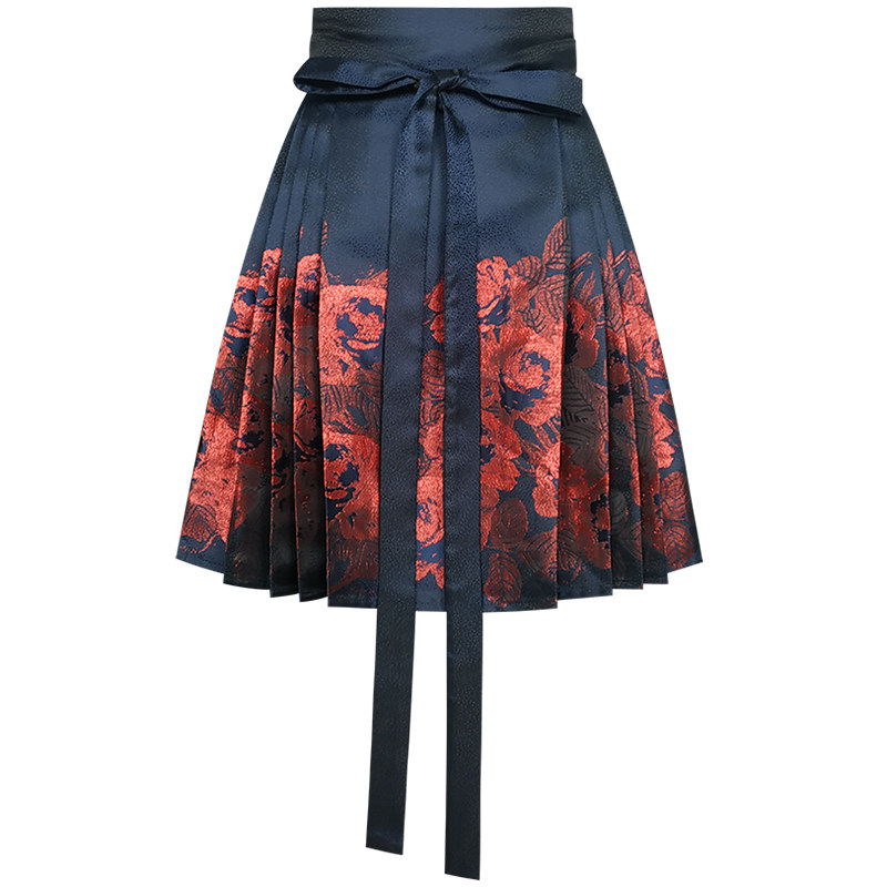 优雅新中式改良马面裙女装百褶国风温柔复古蓝色高腰半身裙2870