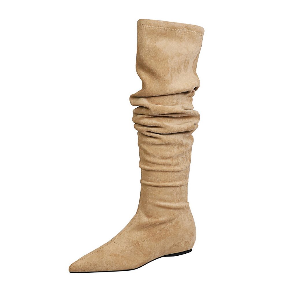 欧美过膝长靴女侧拉链绒面单靴堆堆靴尖头内增高平底坡跟长筒袜靴