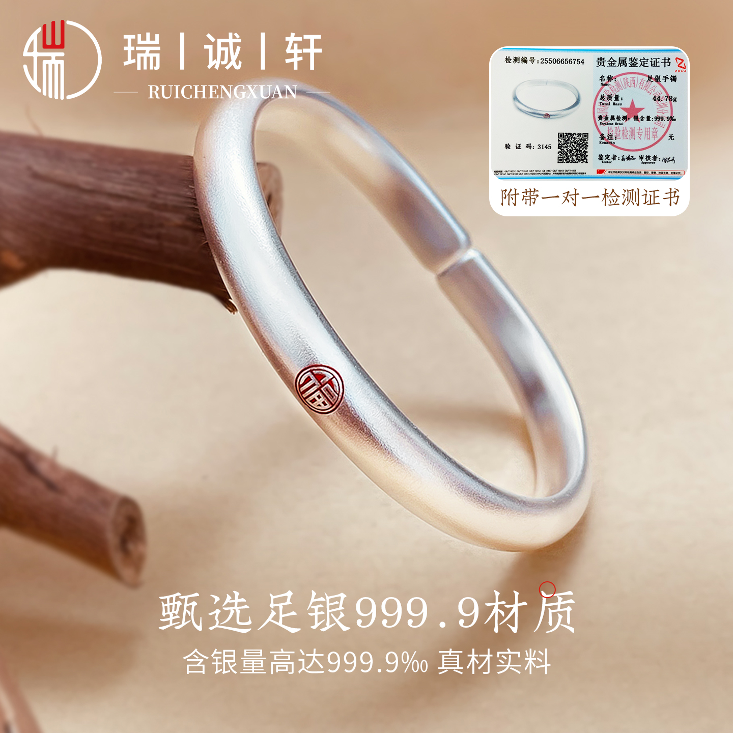 瑞诚轩新中式国风银手镯古法素圈实心9999纯银马蹄镯生日礼物女生