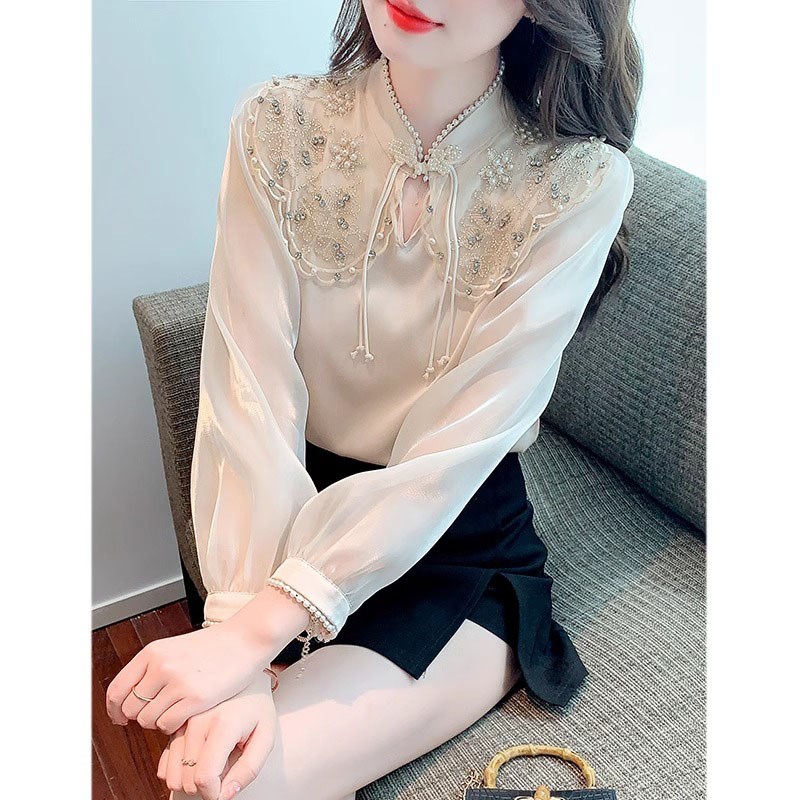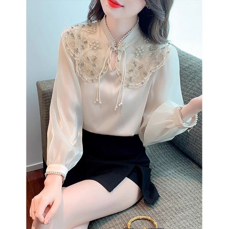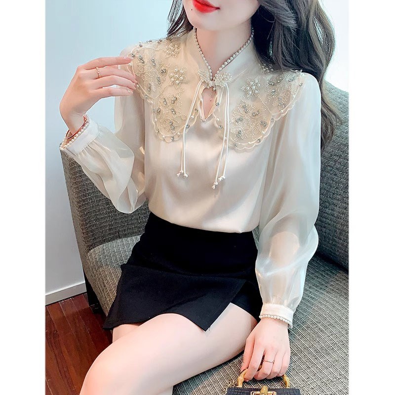 雪纺衬衫女春季2024新款高级设计感洋气小衫刺绣立领长袖打底上衣