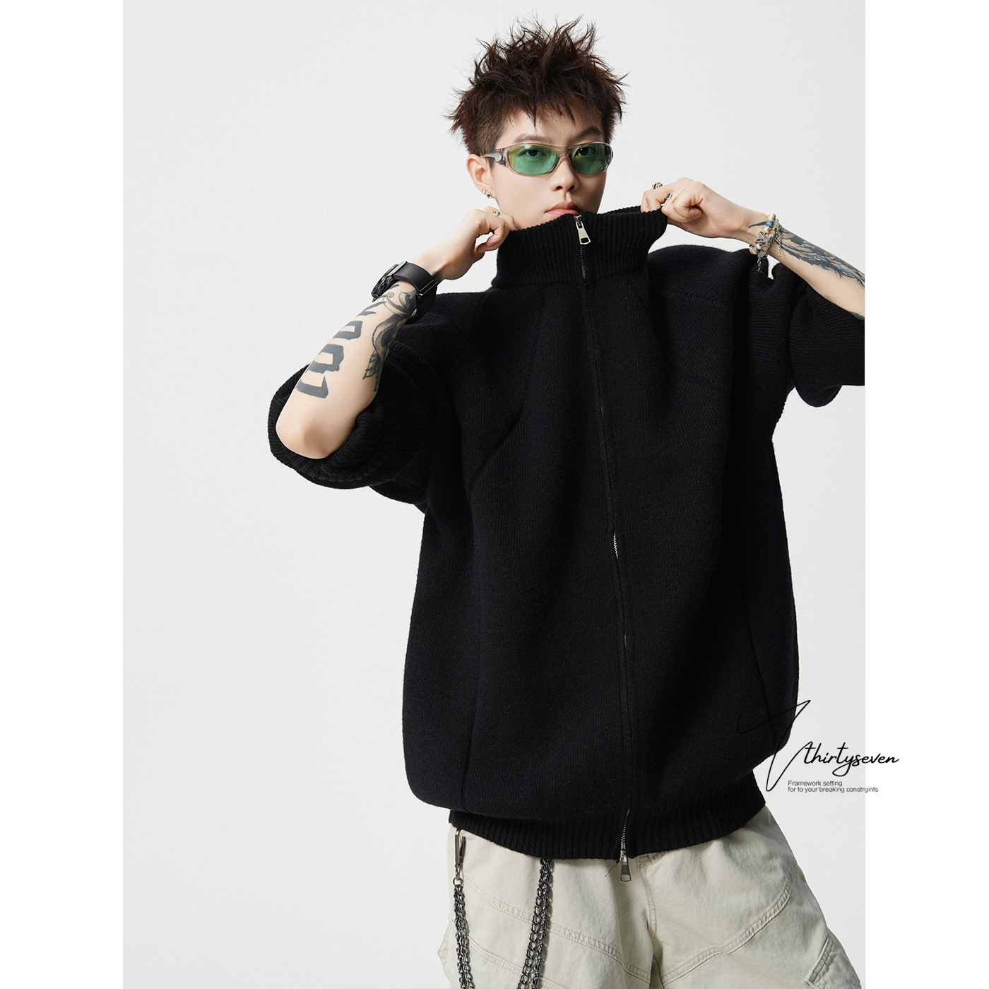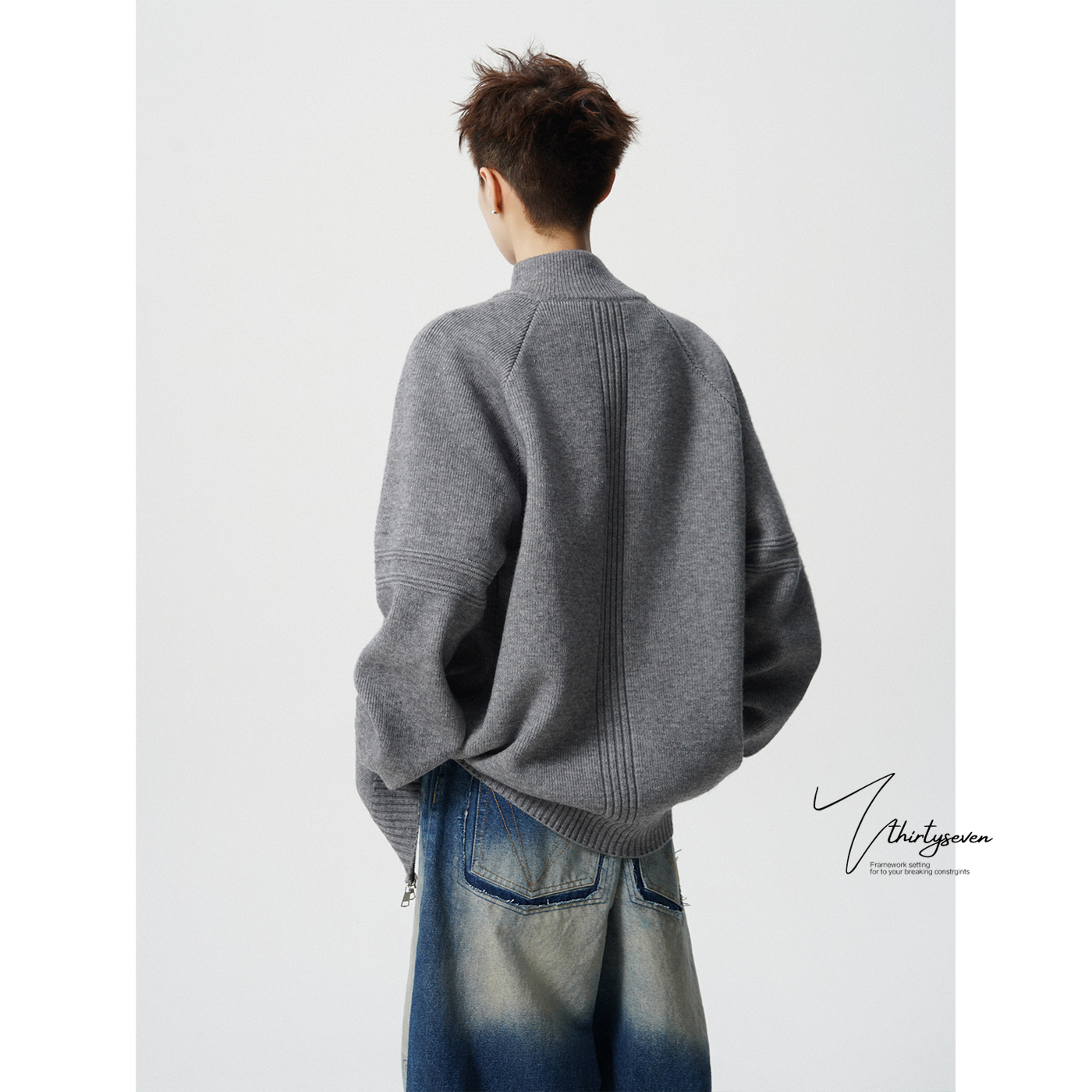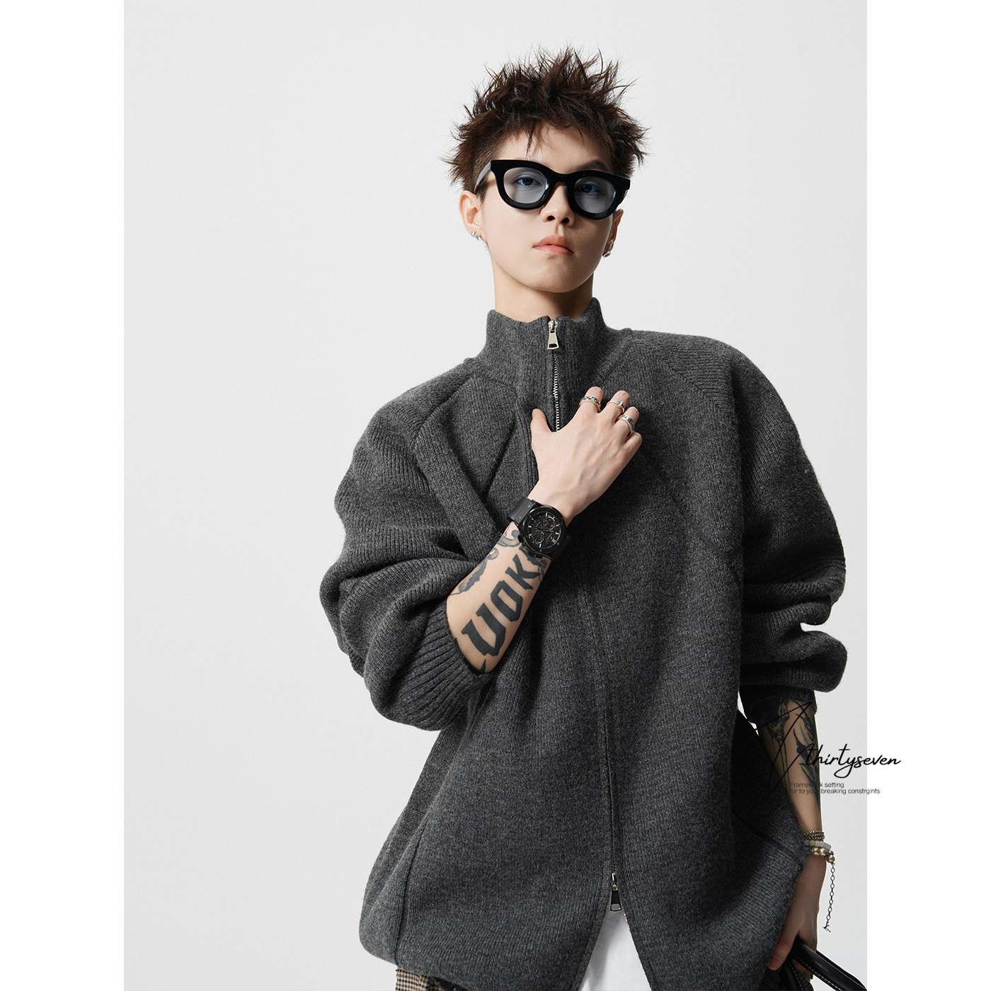 V37老钱风复古双拉链针织开衫男秋季美式解构慵懒风立领毛衣外套