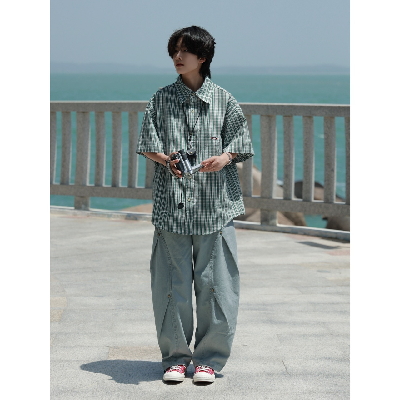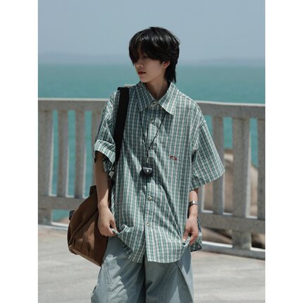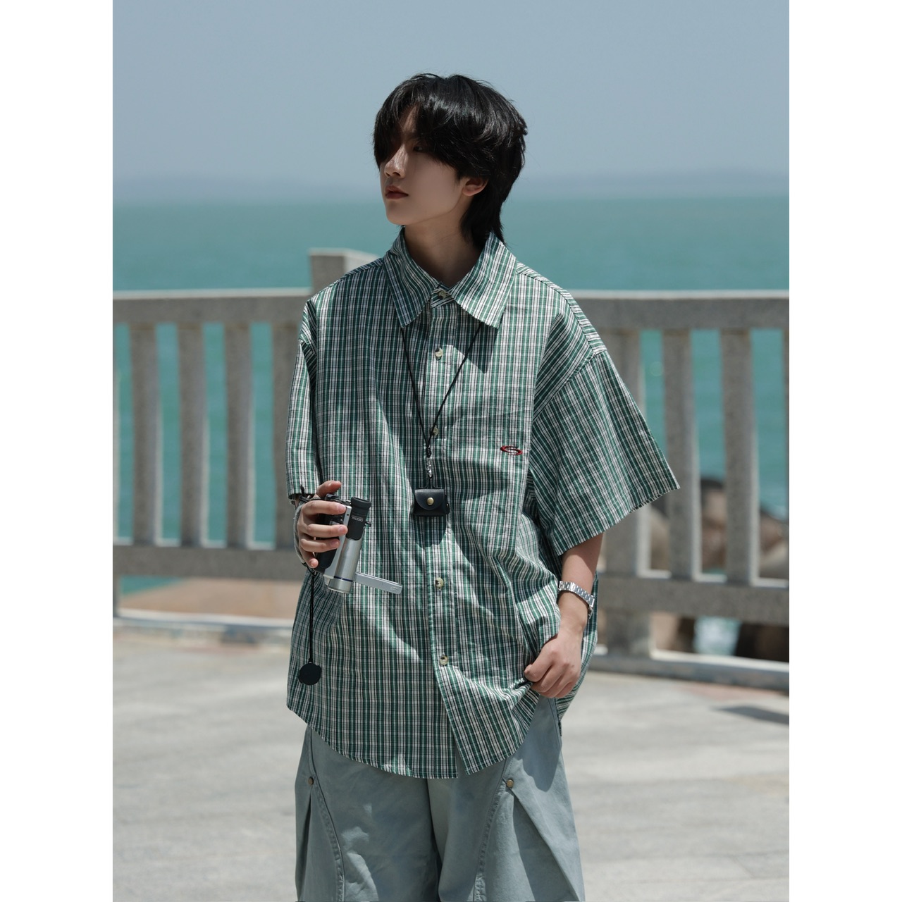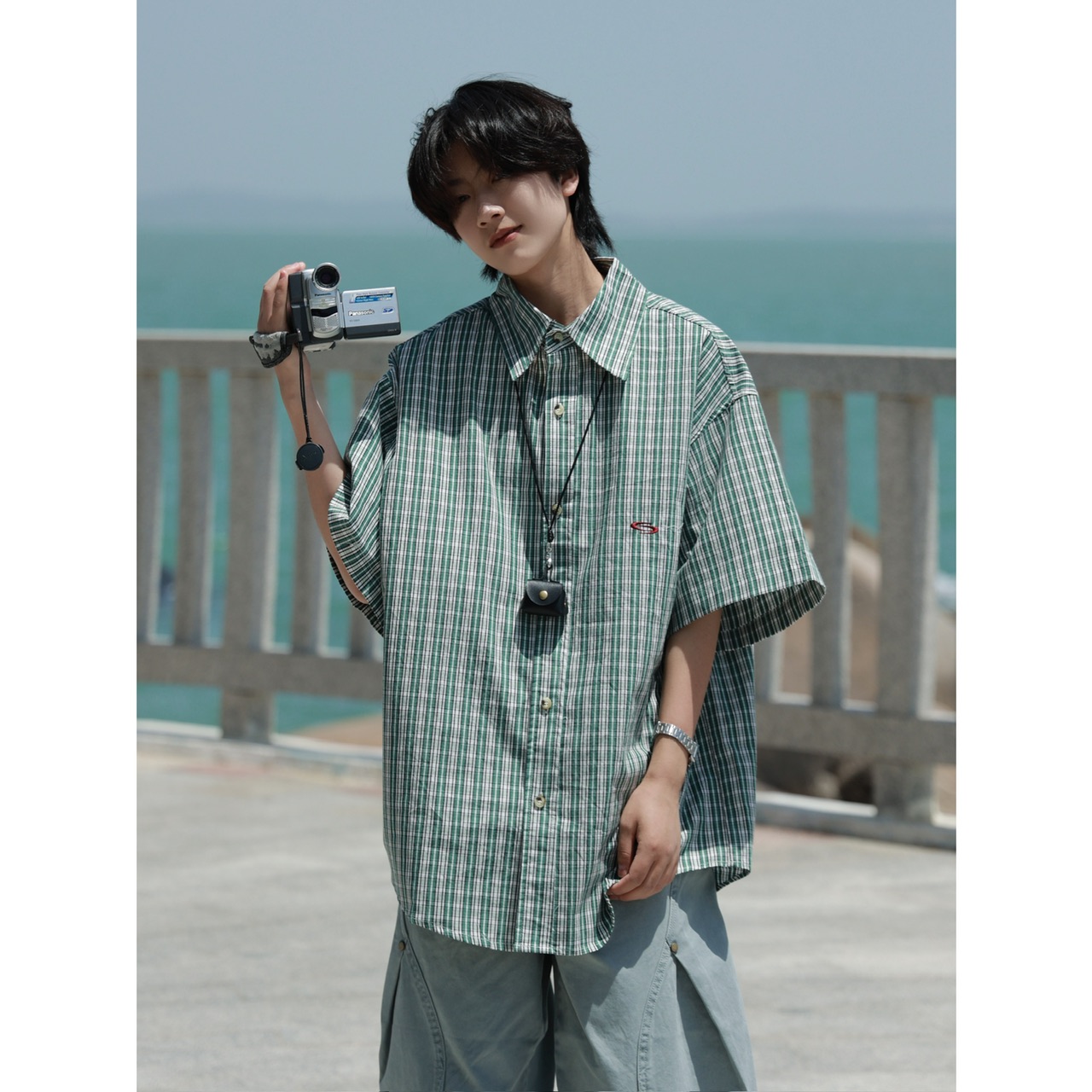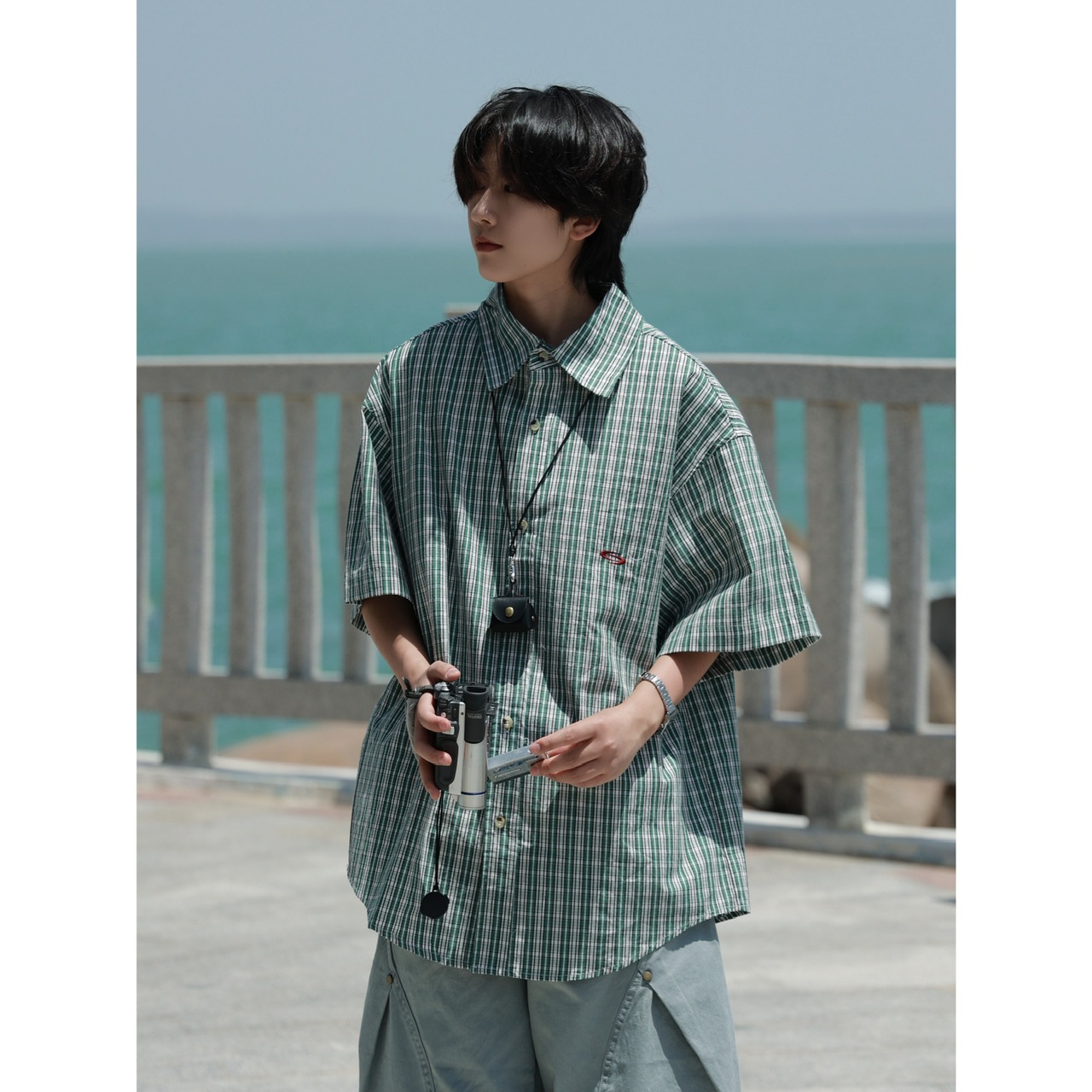 19otiwtt日系复古绿色条纹短袖衬衫男夏季休百搭纯棉宽松半袖衬衣