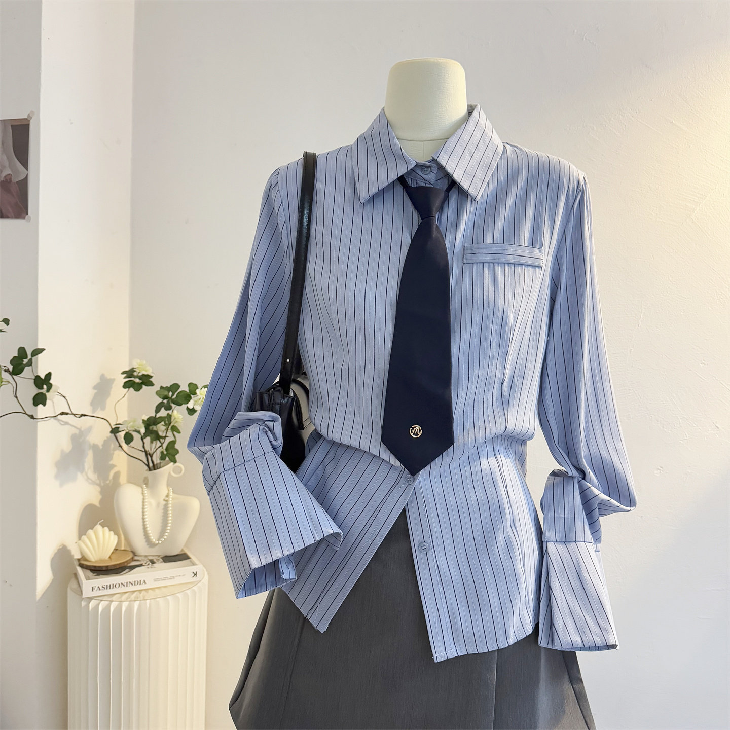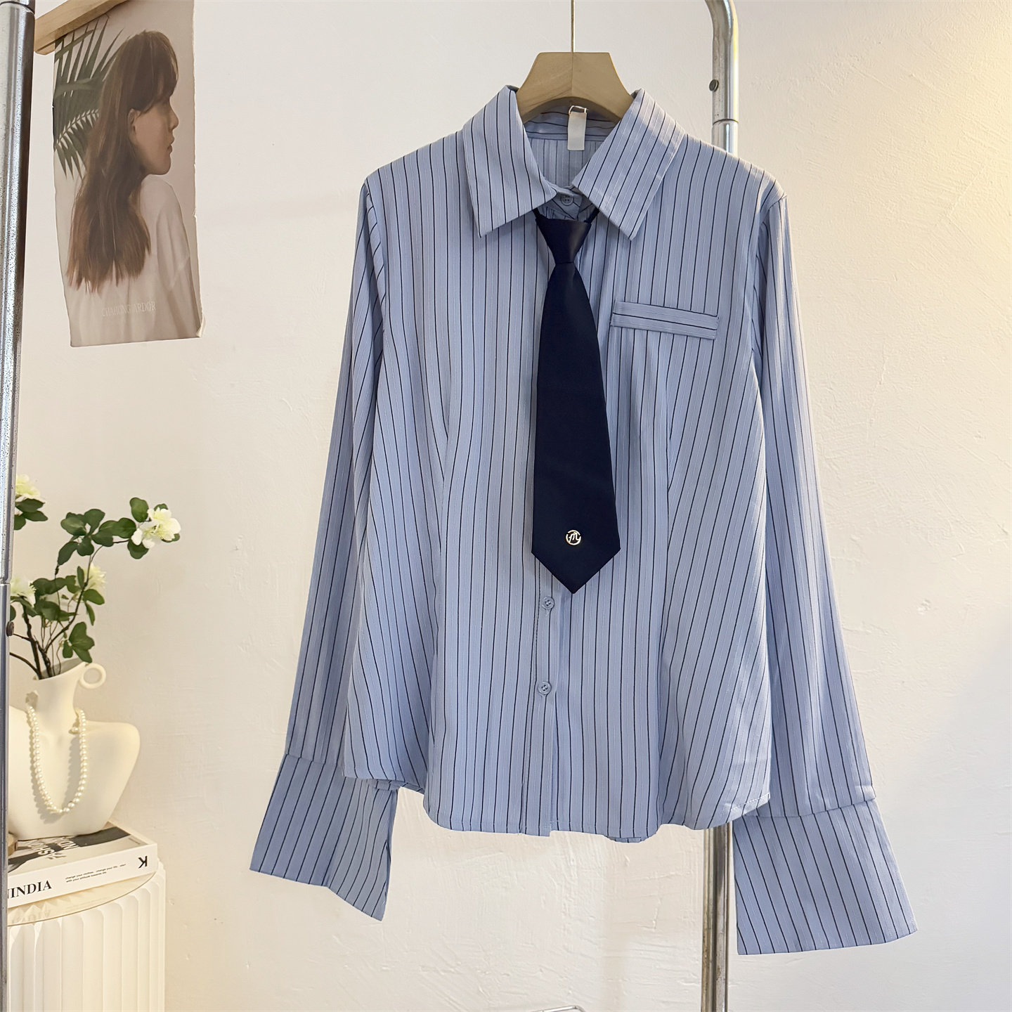 配领带蓝色条纹长袖衬衫女2025秋季设计感小众收腰修身学院风衬衣