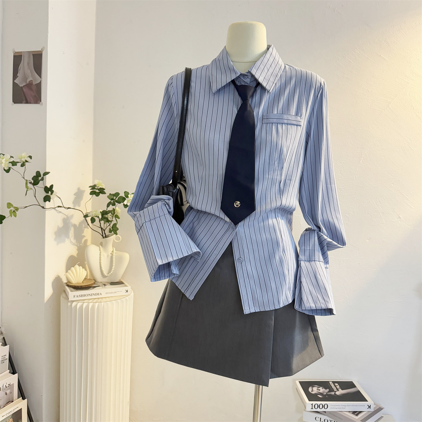 收腰学院风领带蓝色条纹长袖衬衫