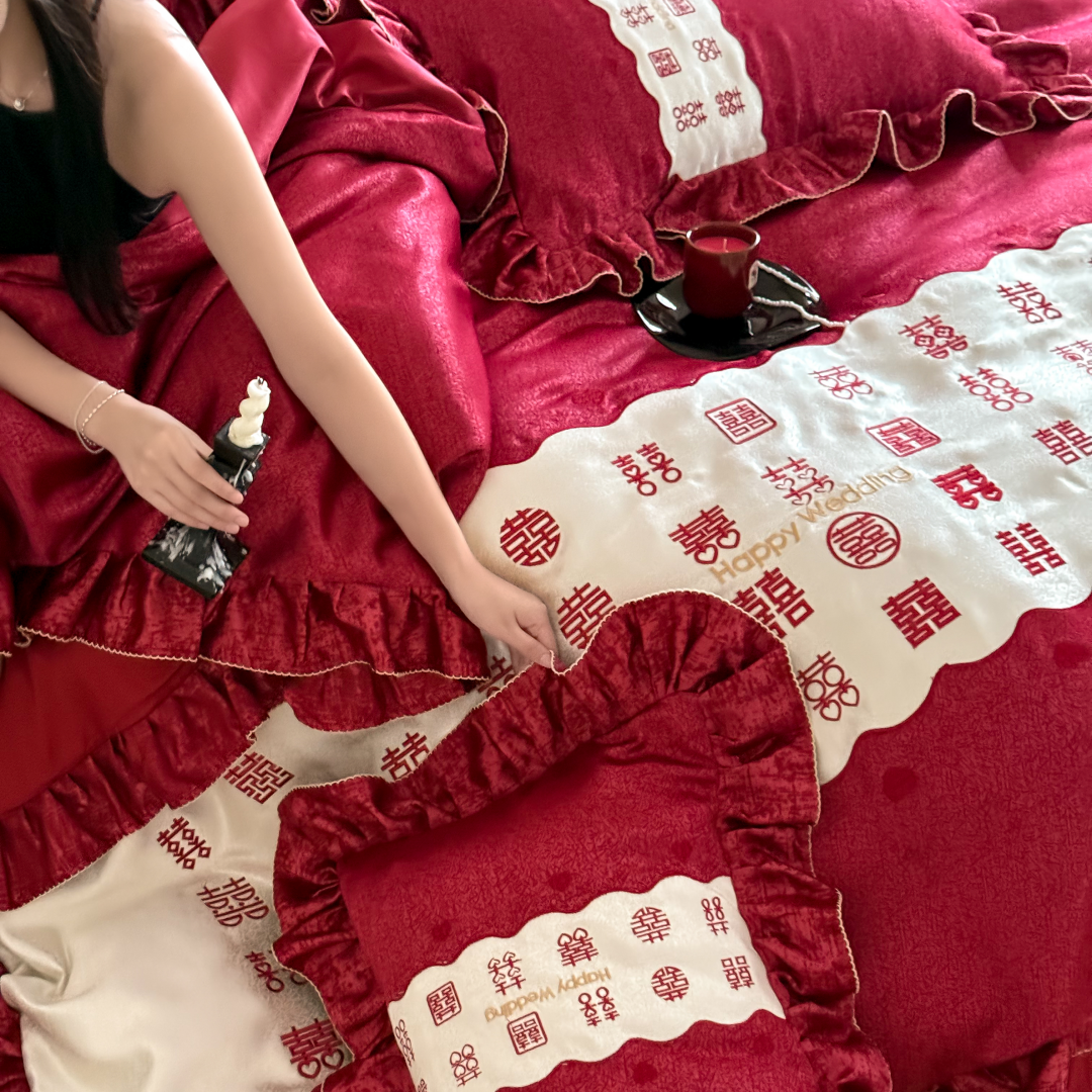 浪漫法式荷叶花边柔丝棉结婚四件套红色喜字刺绣被套床单婚庆床品