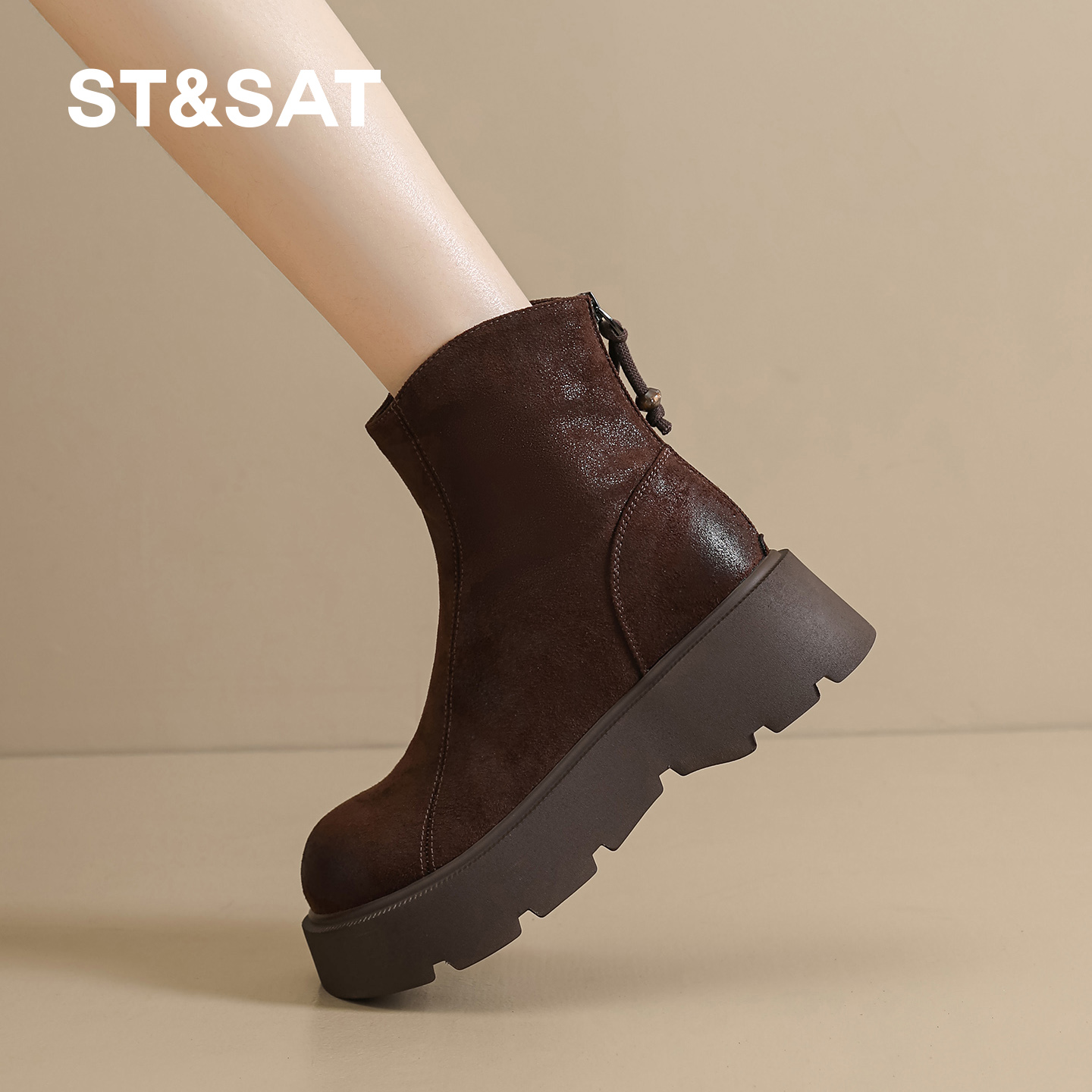 星期六真皮复古厚底马丁靴女2025新款秋季英伦复古瘦瘦短靴子增高