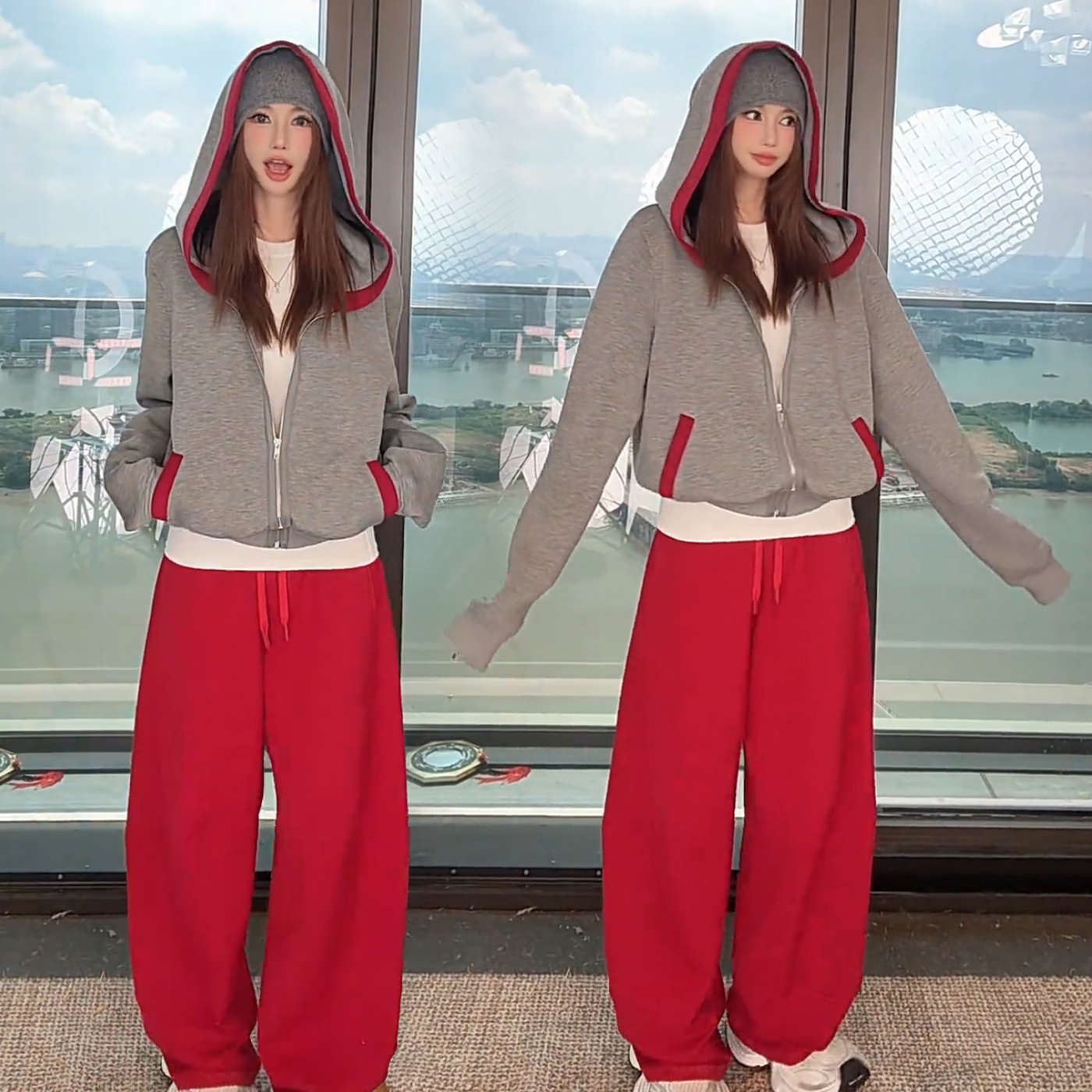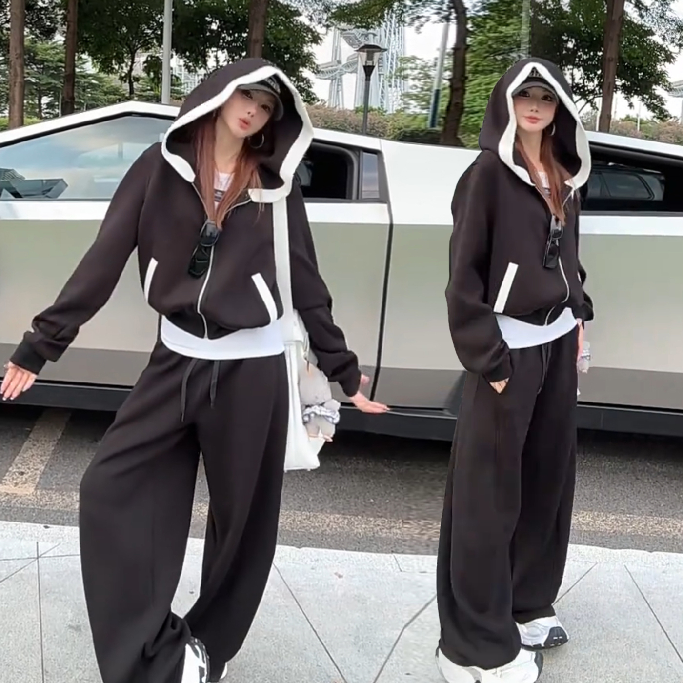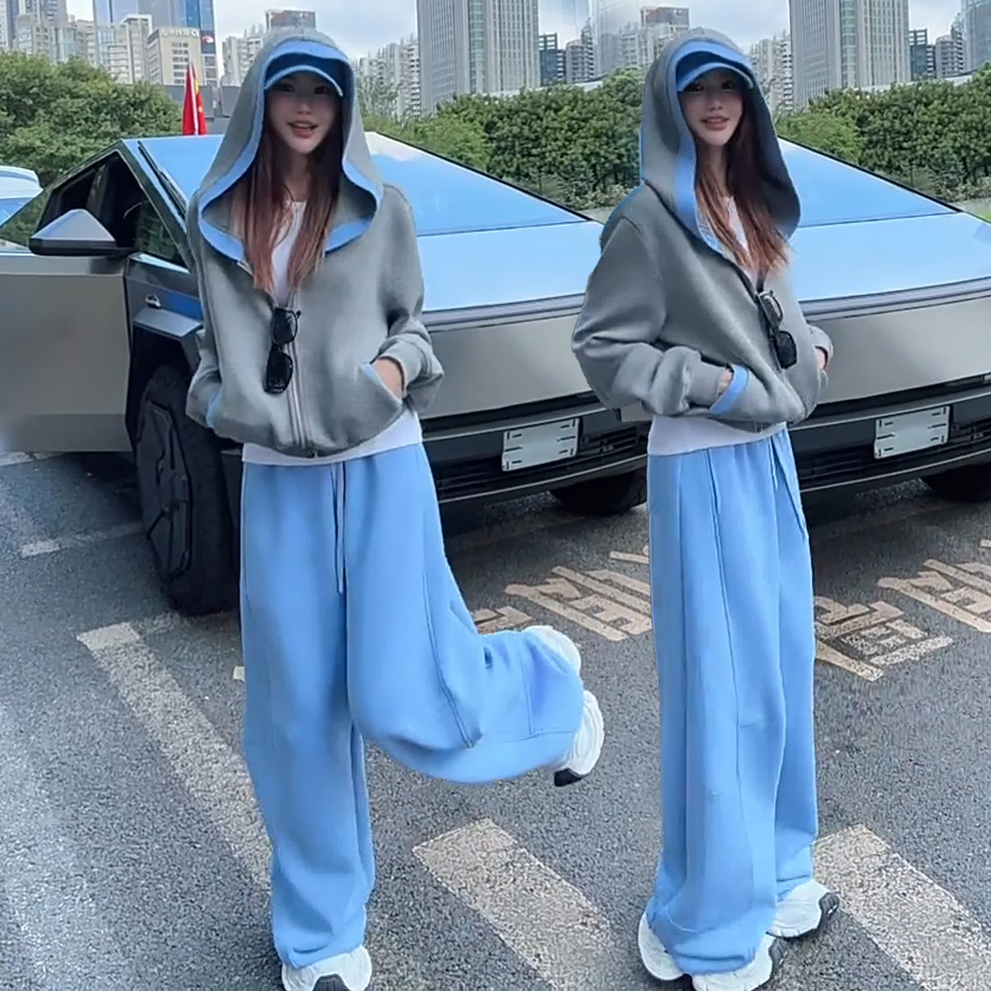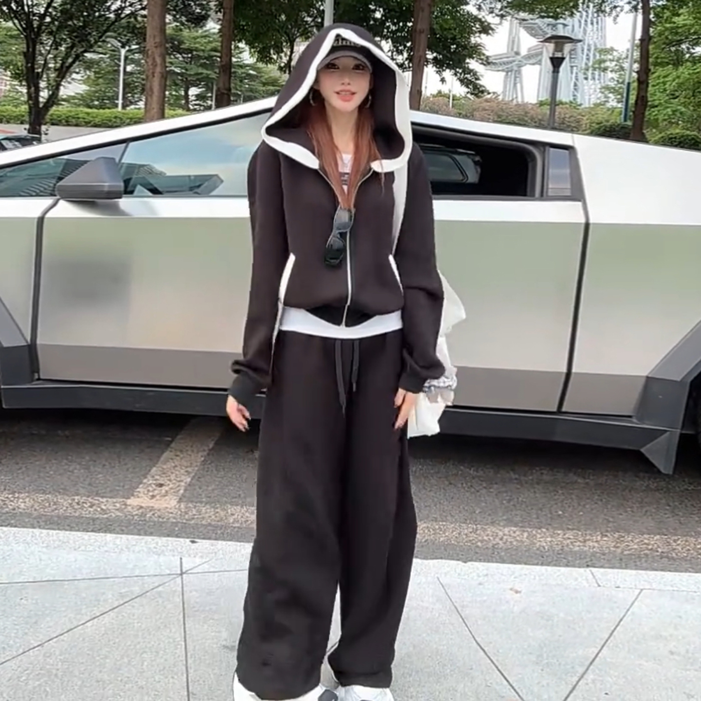 韩系时尚休闲运动服套装女2025春秋新款拼色连帽外套阔腿裤两件套