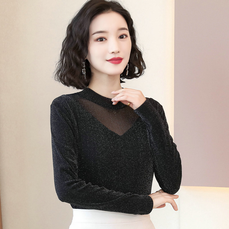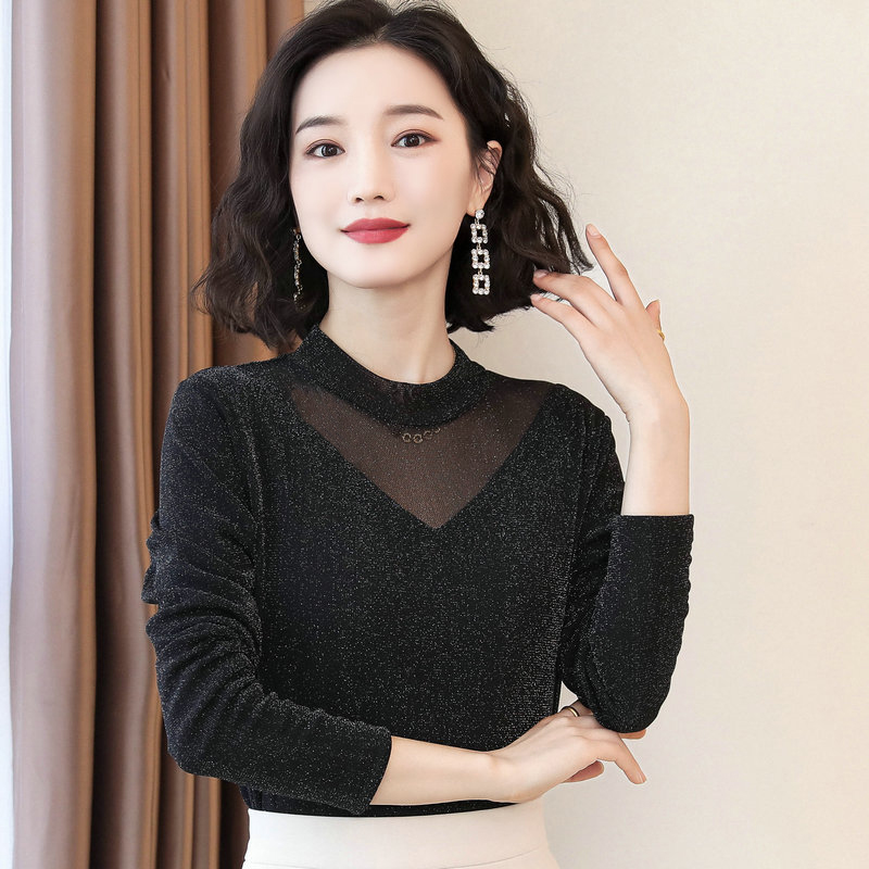 2025春秋新款女装亮丝网纱打底衫女长袖t恤内搭蕾丝衫闪光丝上衣