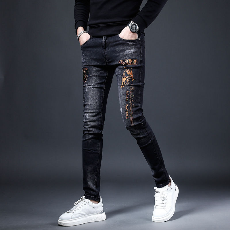 刺绣牛仔裤男秋冬弹力修身小脚裤