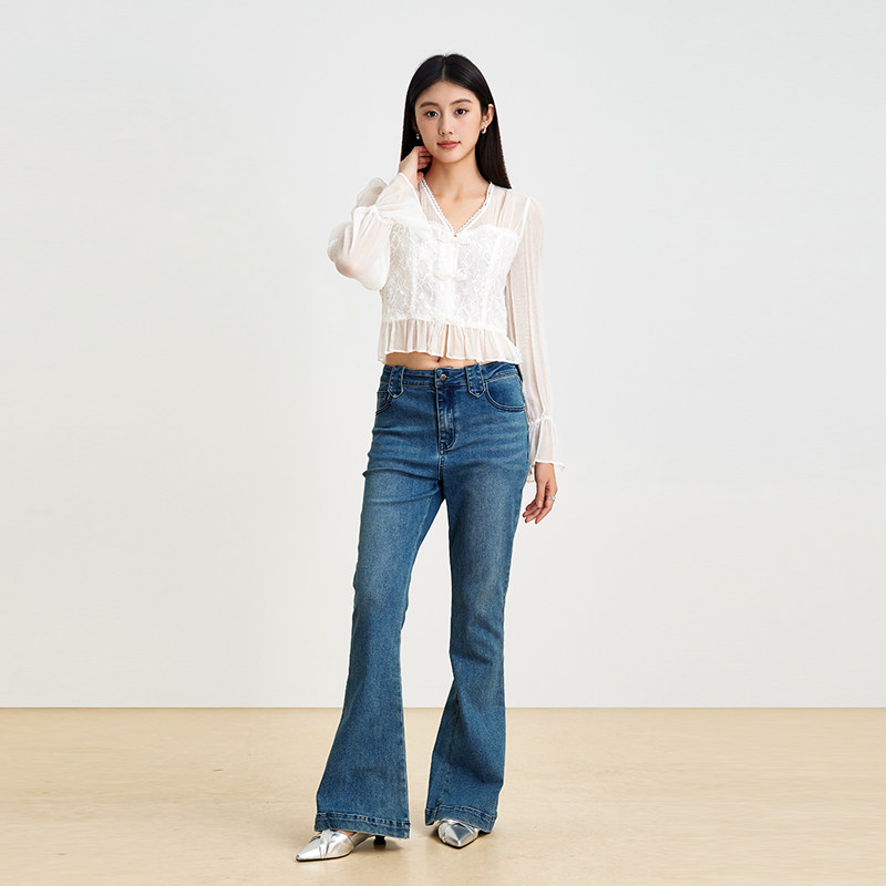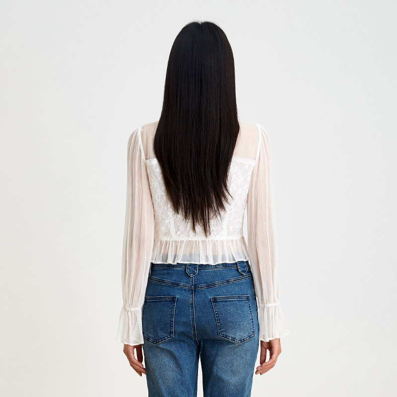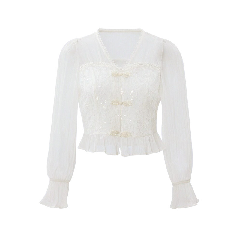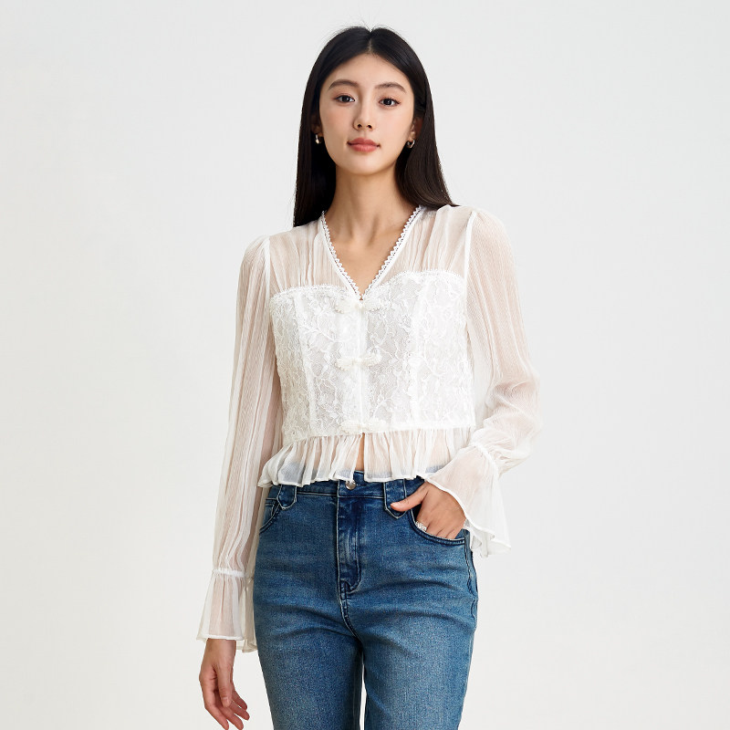 SOMSOM/索玛春季新品淑女风白色蕾丝拼接雪纺衫女长袖V领上衣