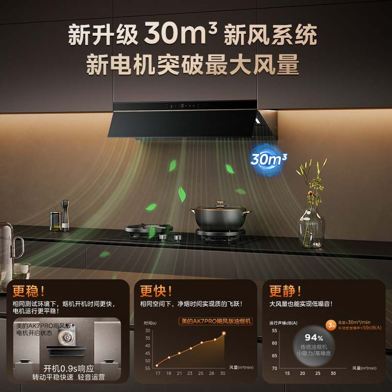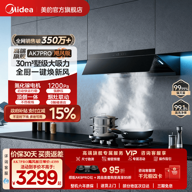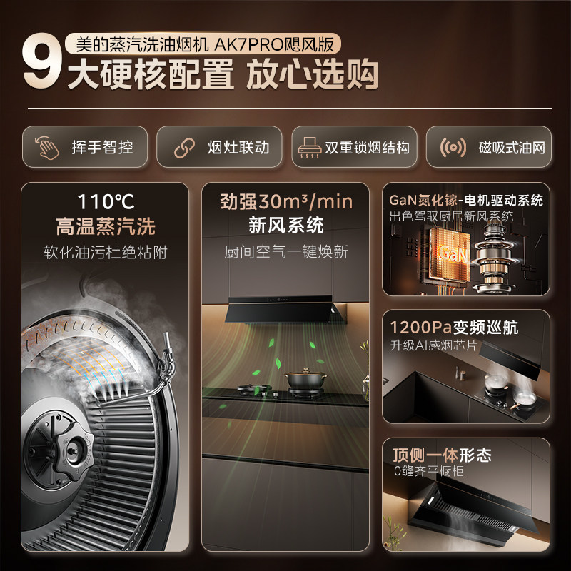 美的AK7PRO飓风版蒸汽洗油烟机家用厨房大吸力官方AK9PRO烟灶套装