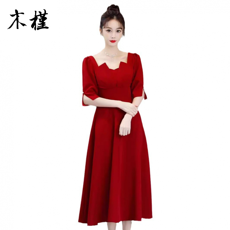 红色连衣裙夏季法式订婚礼服敬酒服平时可穿高腰小个子收腰中长裙