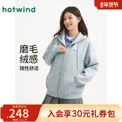 热风女士绒感卫衣2025年秋季新款经典连帽开衫卫衣宽松休闲学院风
