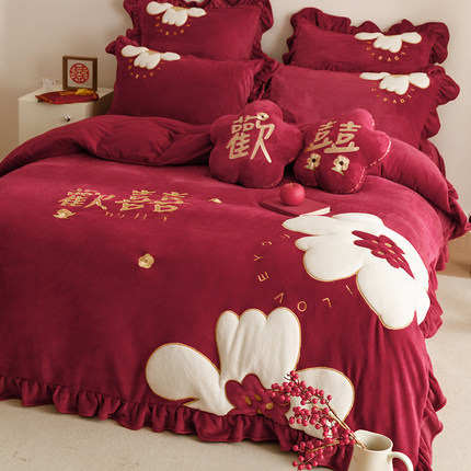 牛奶绒秋冬款结婚四件套珊瑚绒欢喜贴布绣被套法兰绒加厚保暖床单