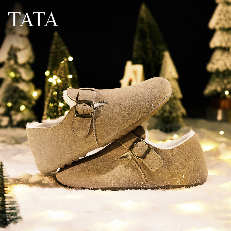 TATA他她棕色复古勃肯鞋加绒女鞋新款轻软通勤平底单鞋CGW02AM5