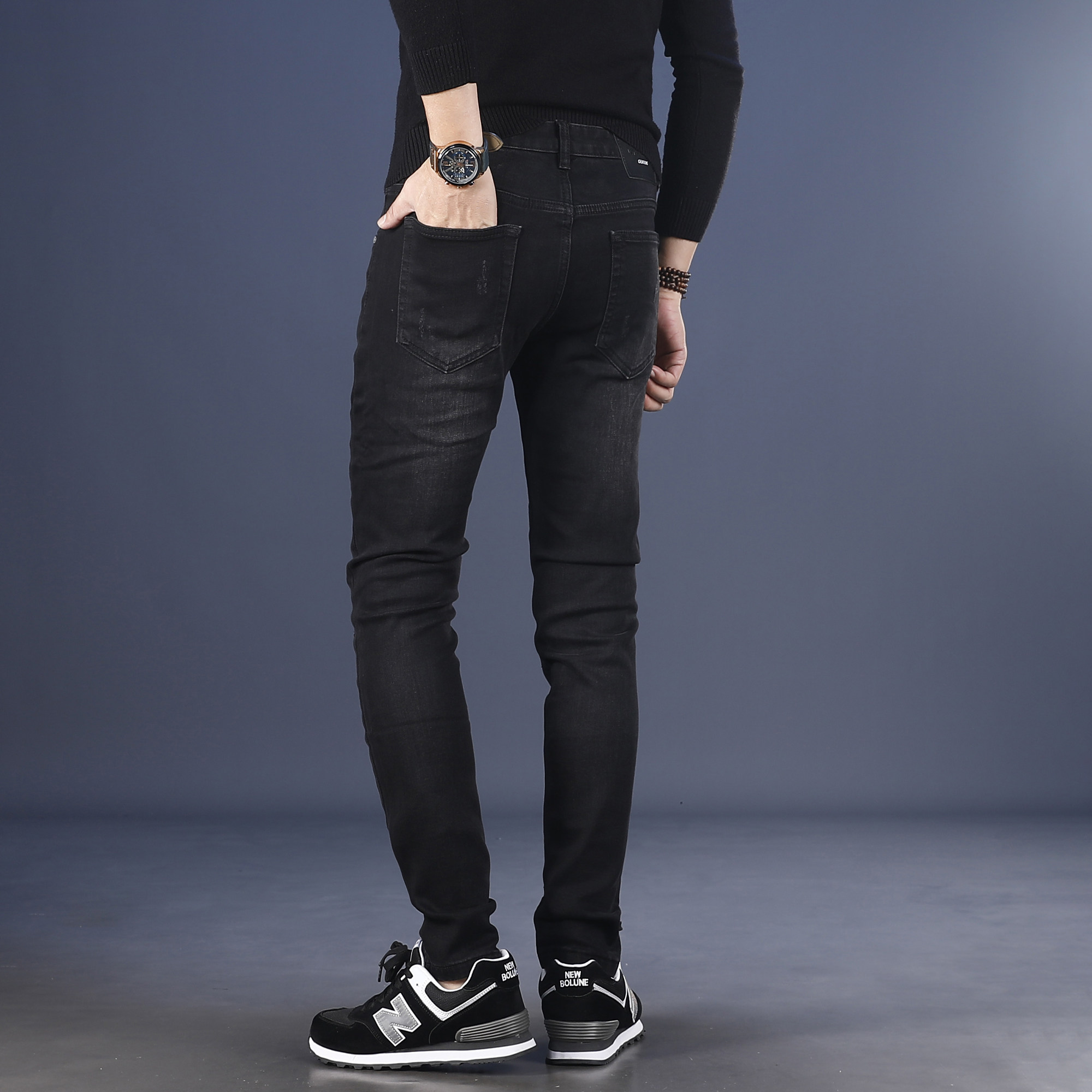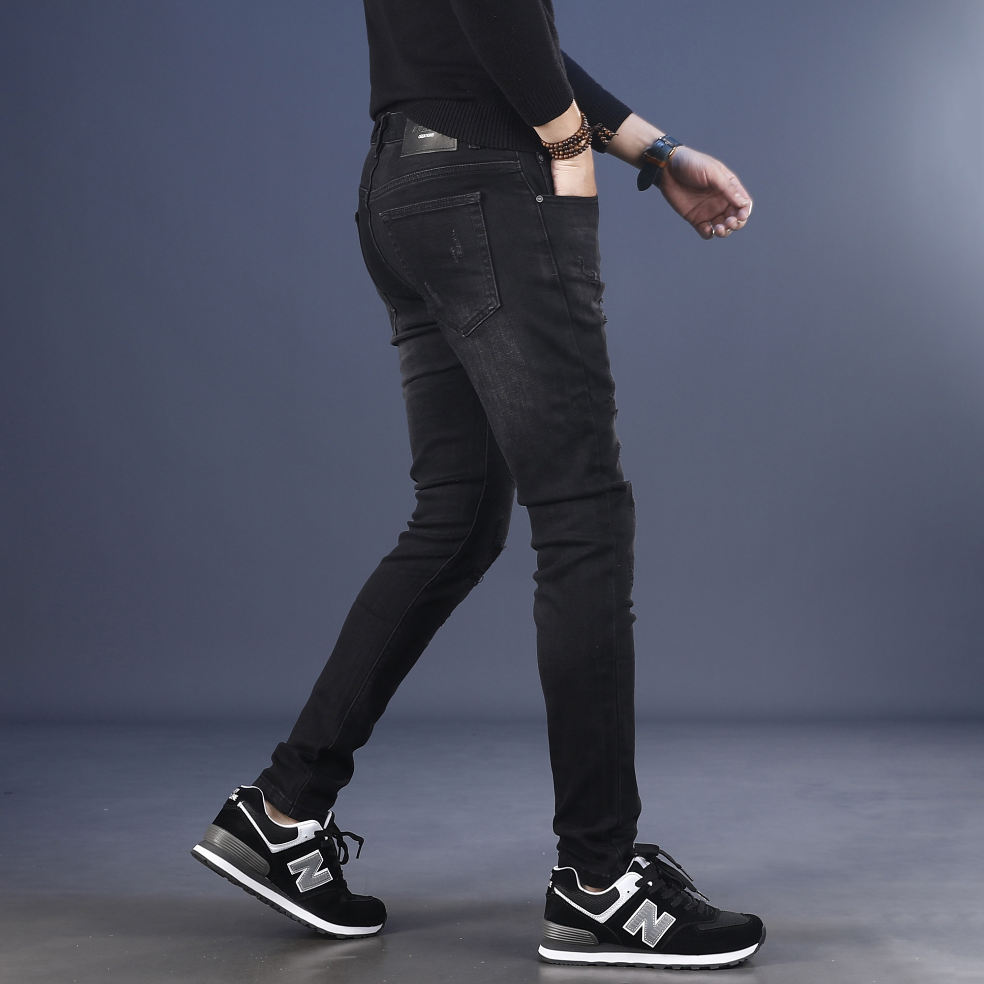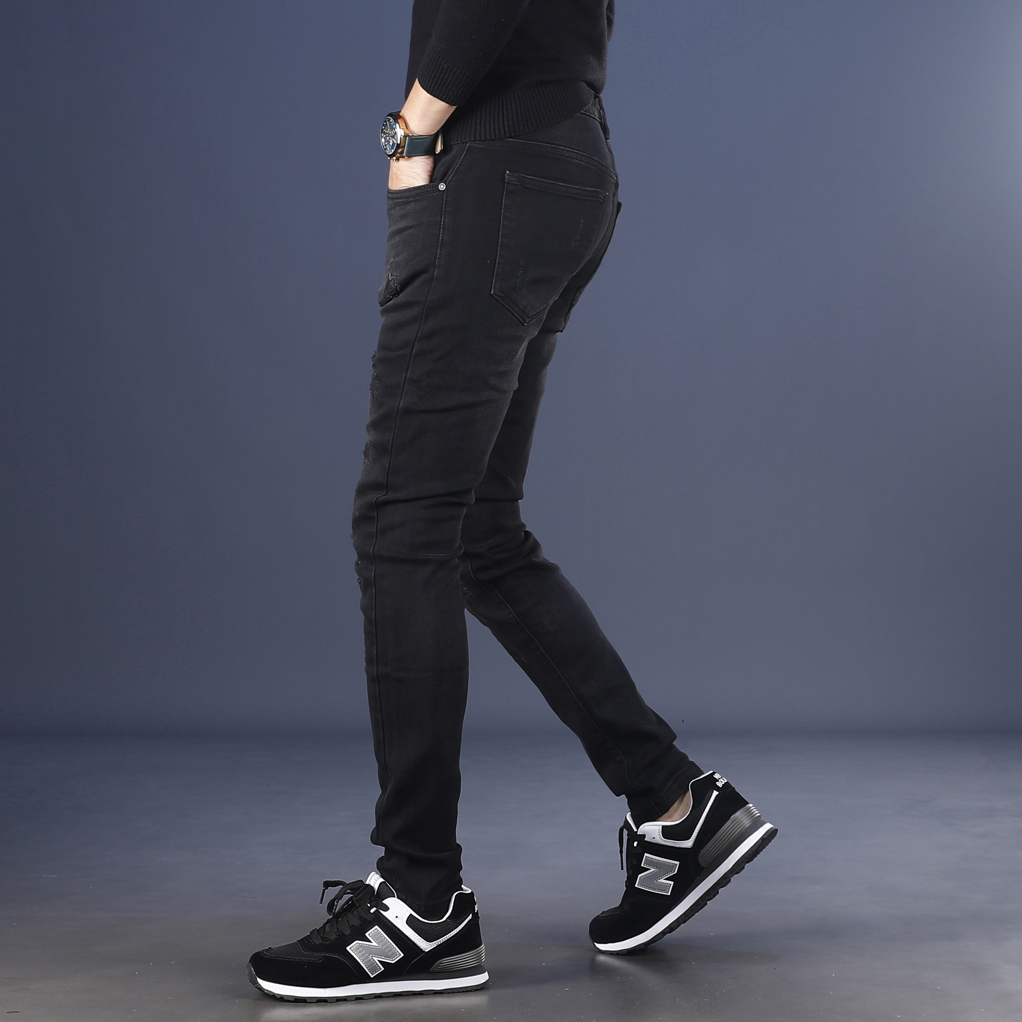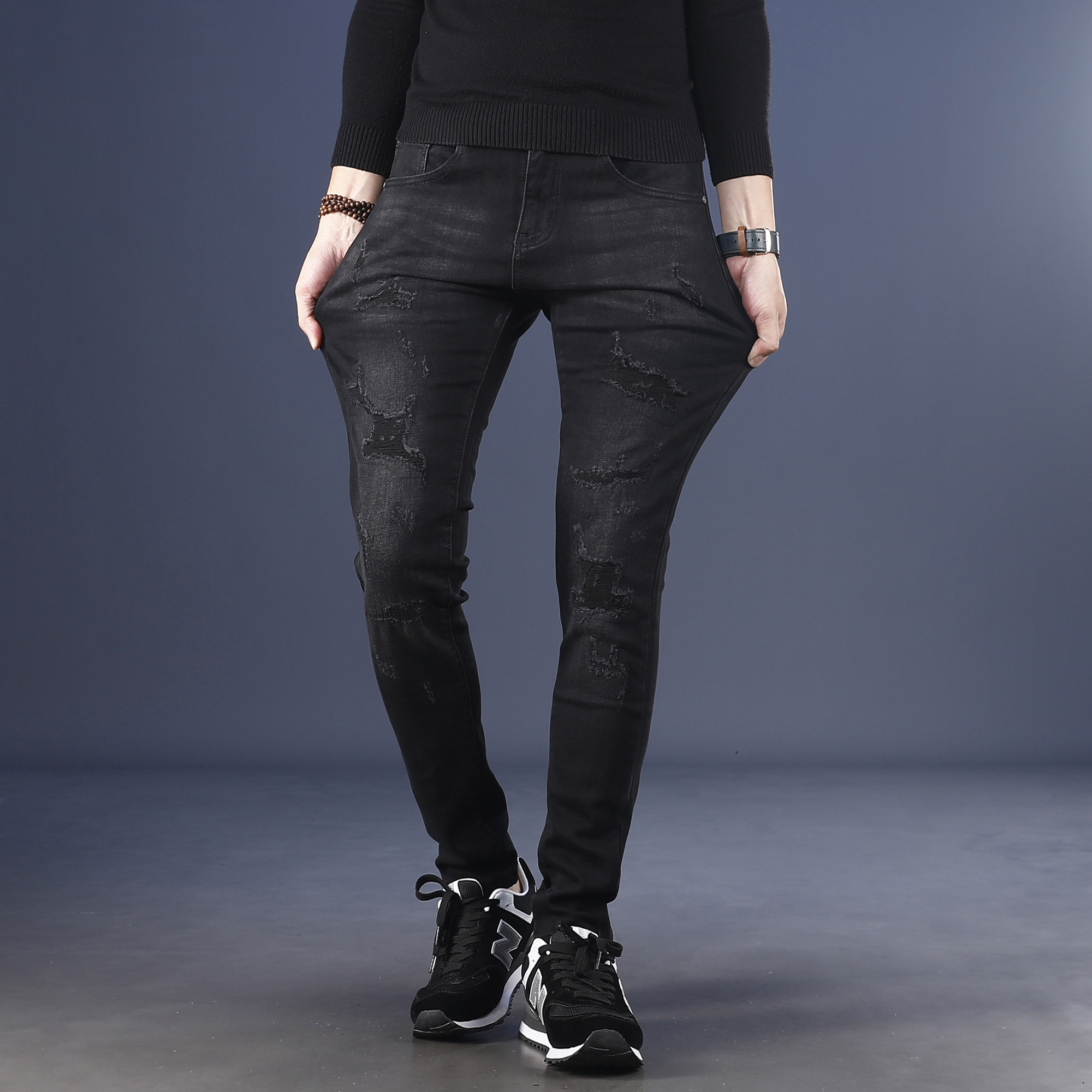 秋冬黑色破洞补丁牛仔裤男抓绒亲肤保暖修身小脚显瘦潮流加厚裤子