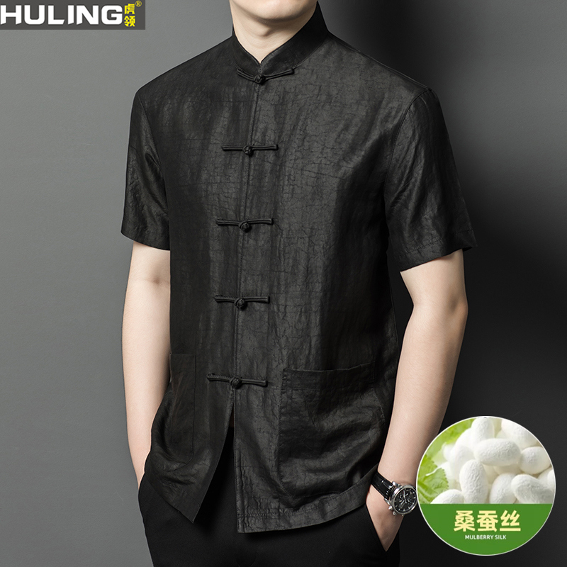 龟裂纹香云纱唐装短袖100%桑蚕丝男士立领衬衣中年盘扣真丝薄上衣