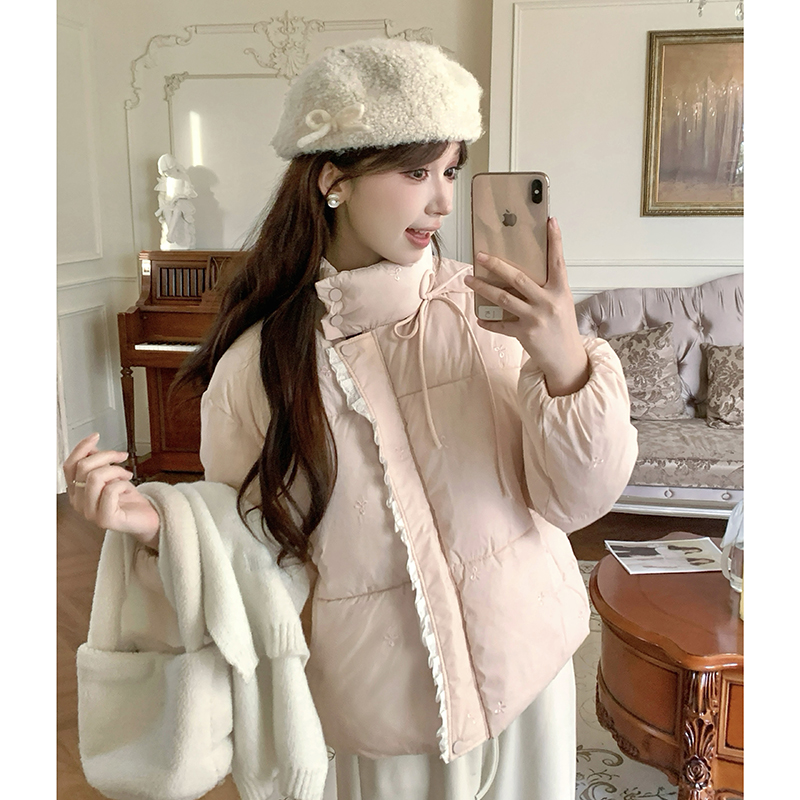 韩版甜美粉色蝴蝶结立领棉服女新款小个子加厚面包服棉衣外套