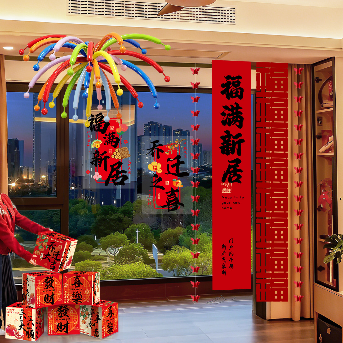 乔迁新府居房客厅布置背景挂布装饰搬家入宅灯笼用品条幅阳台窗帘