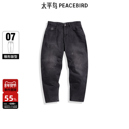 太平鸟男装黑色水洗做旧牛仔裤秋季潮流潮牌弹力锥形长裤