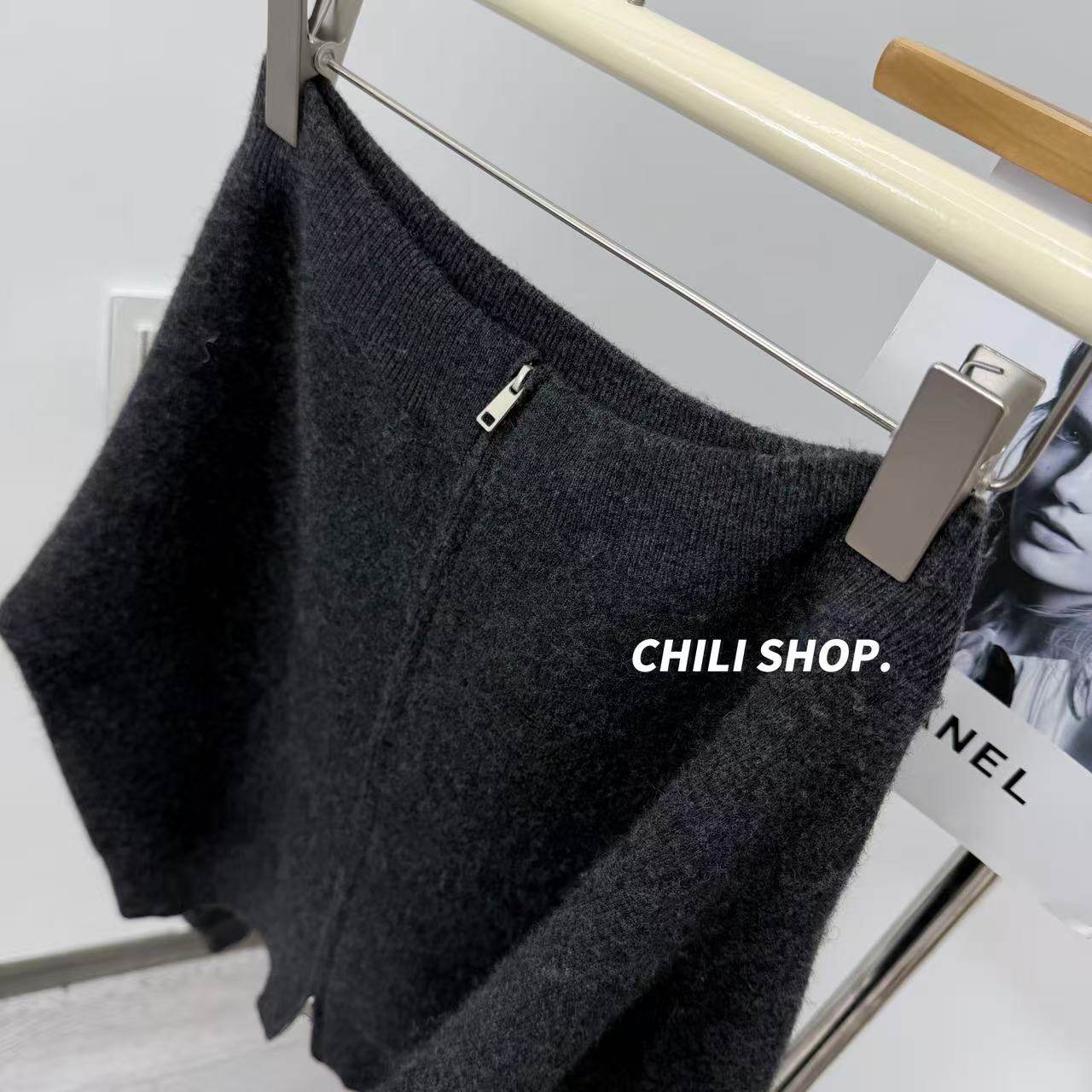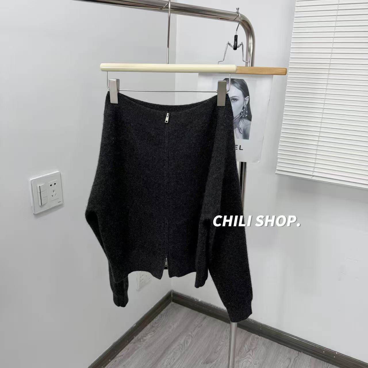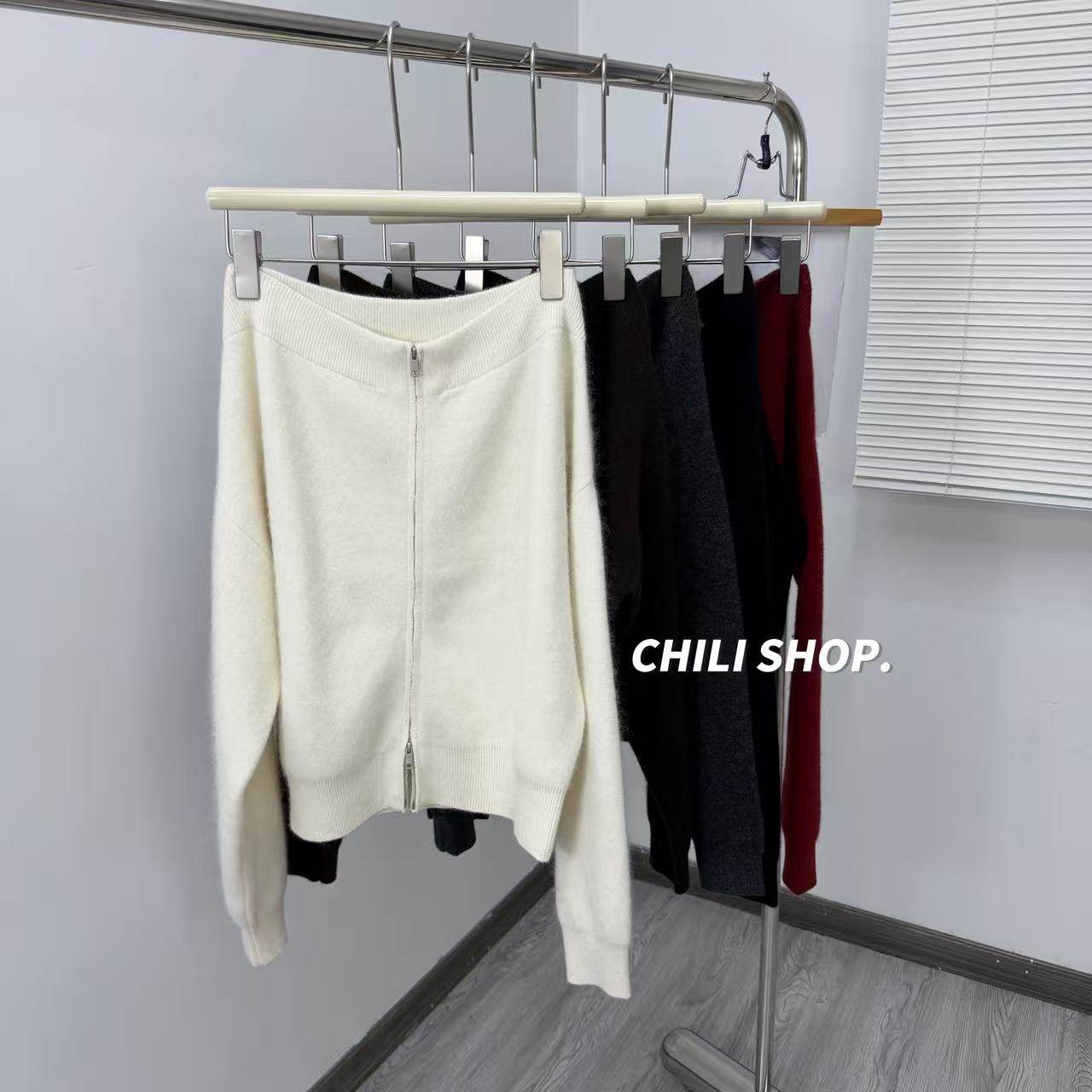 【英英Chili】一字肩拉链时髦设计师款韩系浣熊绒针织毛衣 12.08
