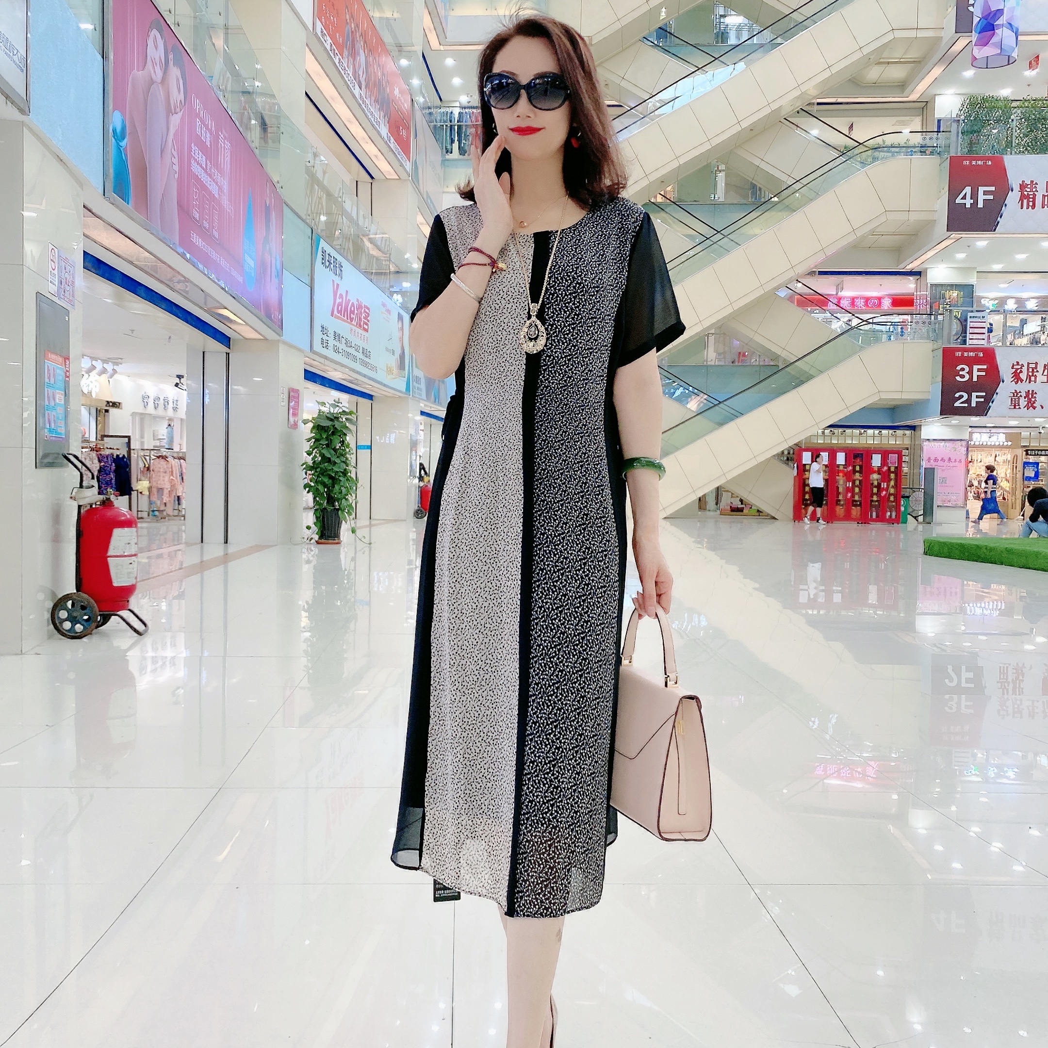 中老年妈妈装夏真丝桑蚕丝轻奢气质洋气遮肚拼接阔太过膝长连衣裙