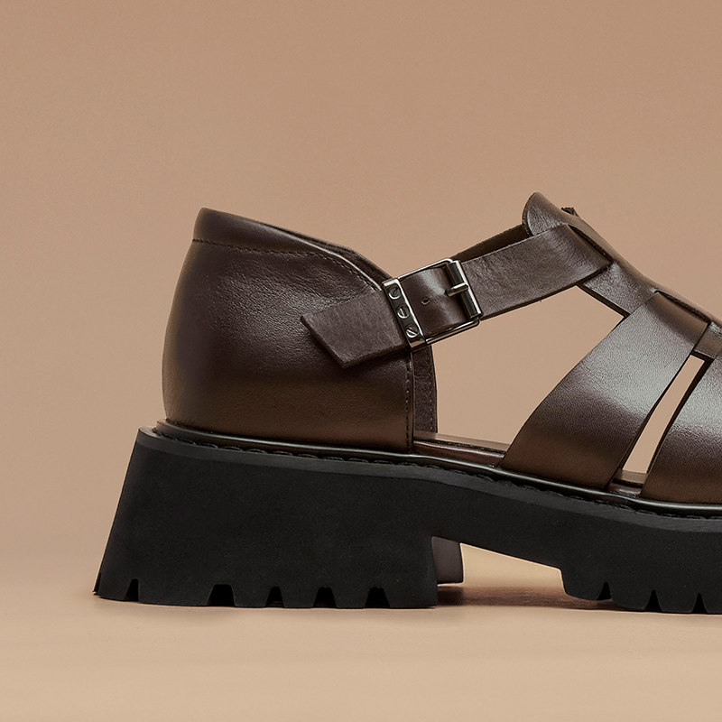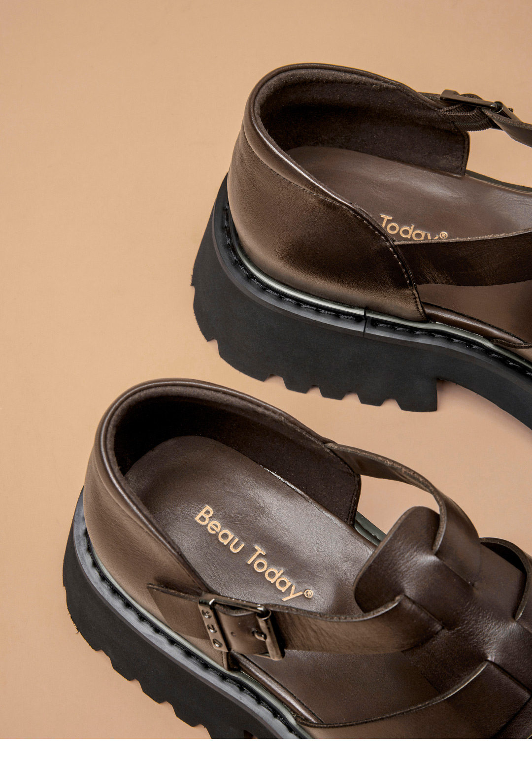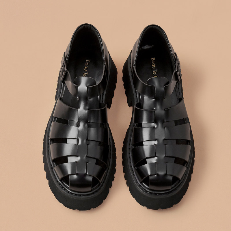 【清仓款】BeauToday厚底包头罗马凉鞋男士镂空真皮增高外穿凉鞋