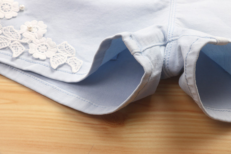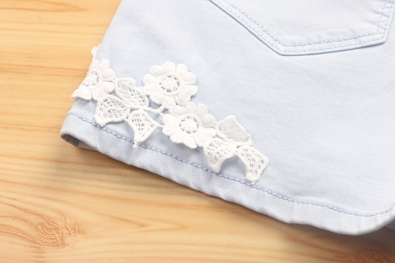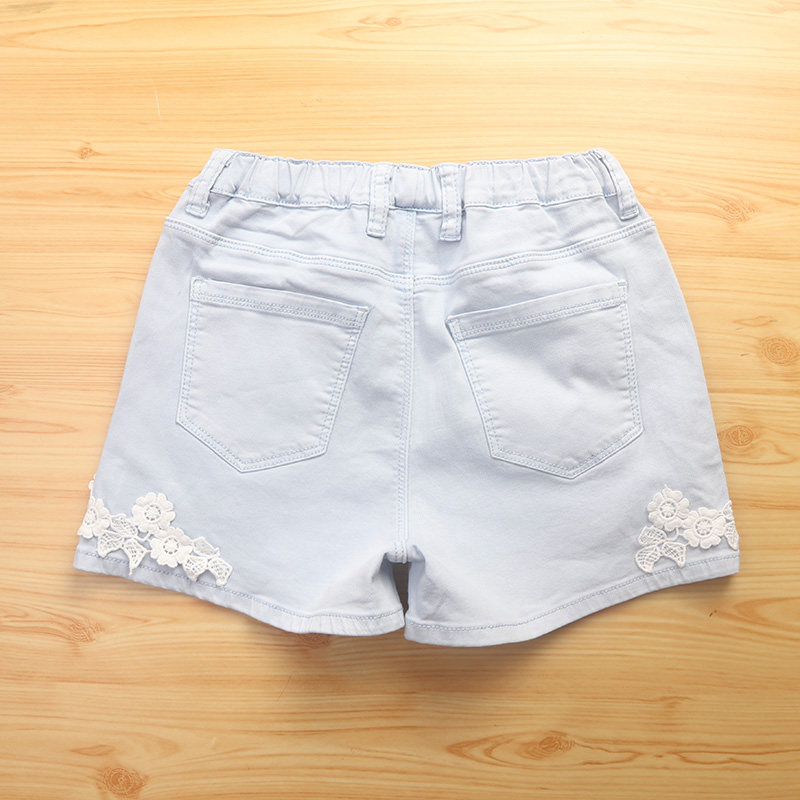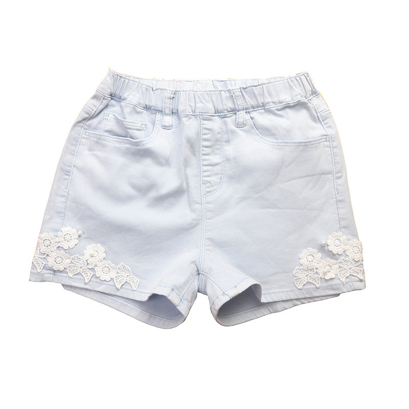 女童短裤 大童浅蓝松紧高腰蕾丝边珠珠弹力牛仔热裤 撤柜
