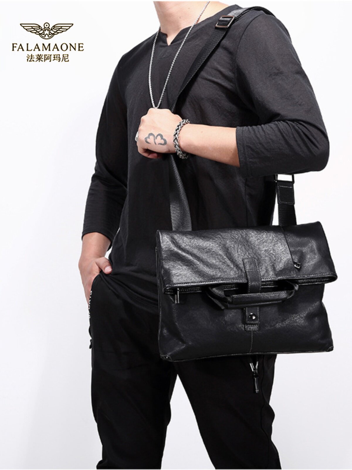 正品法莱阿玛尼牛皮单肩包男士时尚真皮斜跨包可折叠商务包2025款