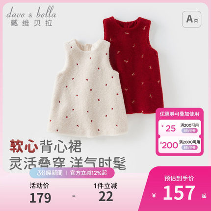 戴维贝拉儿童毛绒背心裙冬装圣诞连衣裙女童保暖红色新年裙子童装
