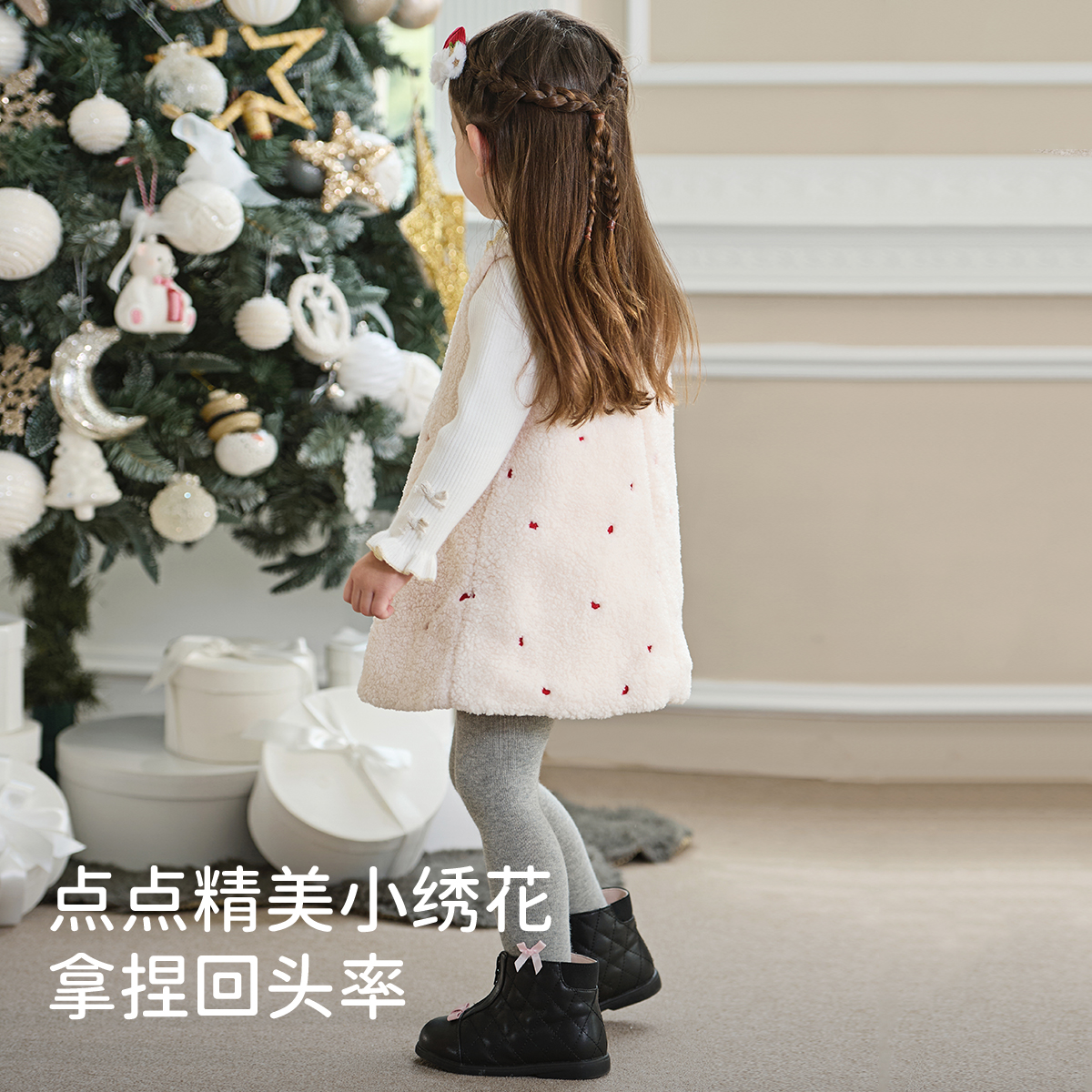 戴维贝拉儿童毛绒背心裙冬装新款连衣裙女童保暖红色新年裙子童装
