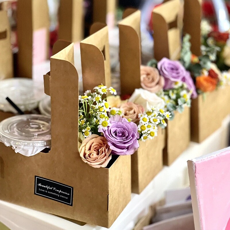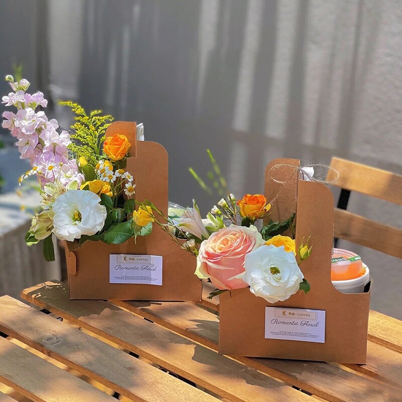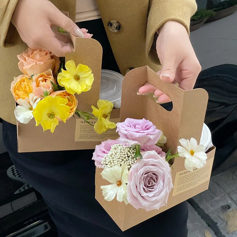 鲜花奶茶手提盒牛皮纸包装盒插花手提花盒花束材料礼盒花艺半成品