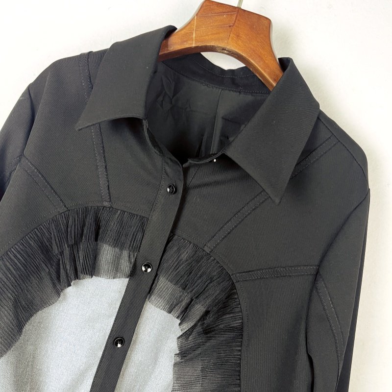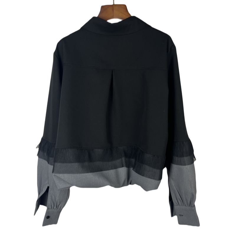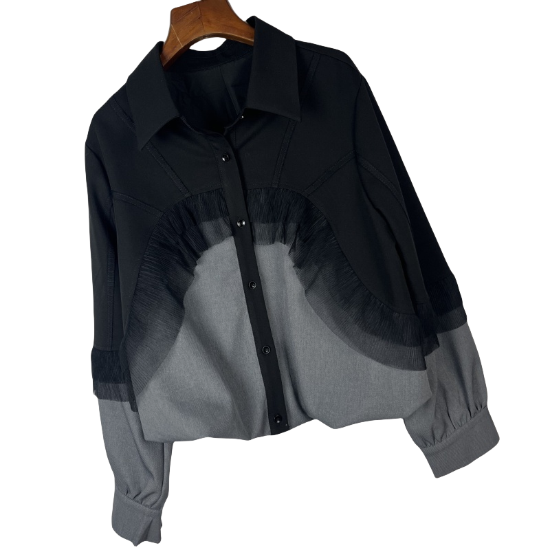 2025春季女百搭显网纱翻领荷叶边拼接牛仔时尚网宽松短款外套减龄