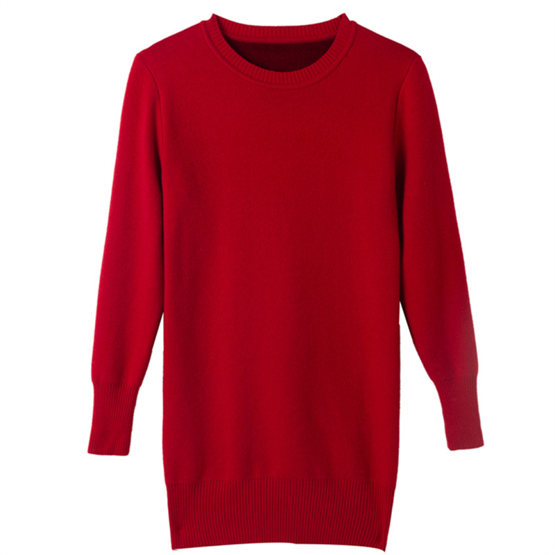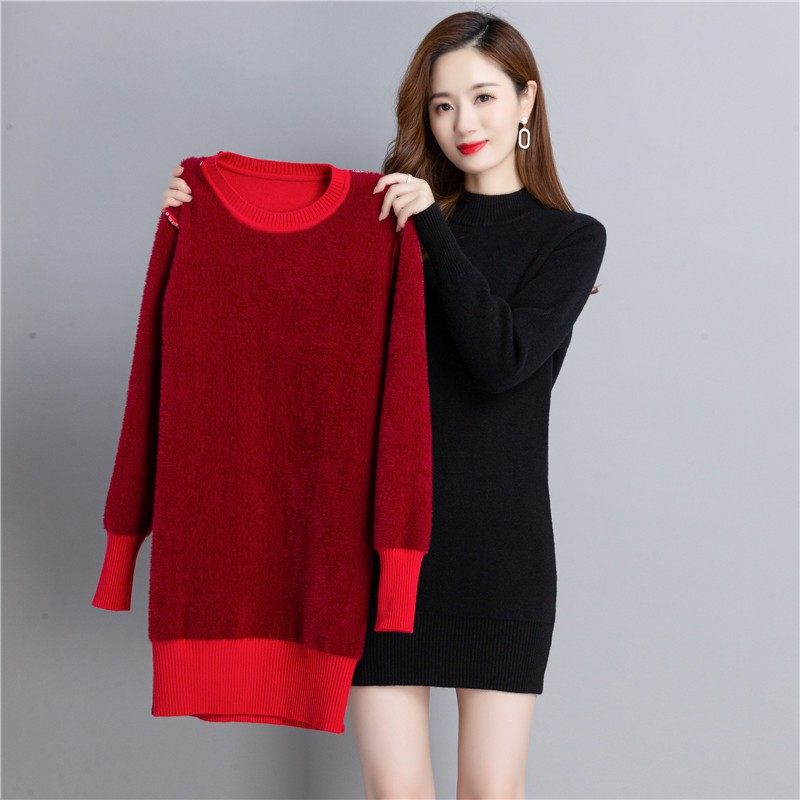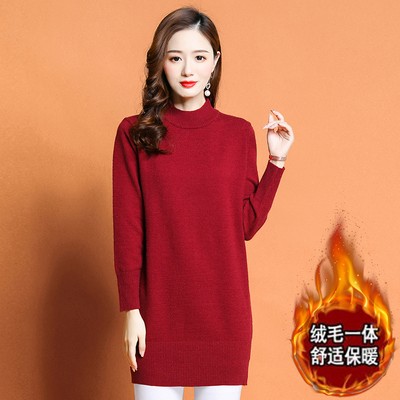 秋冬季中长款半高领加绒毛衣女一体绒加厚宽松打底内搭大码针织衫