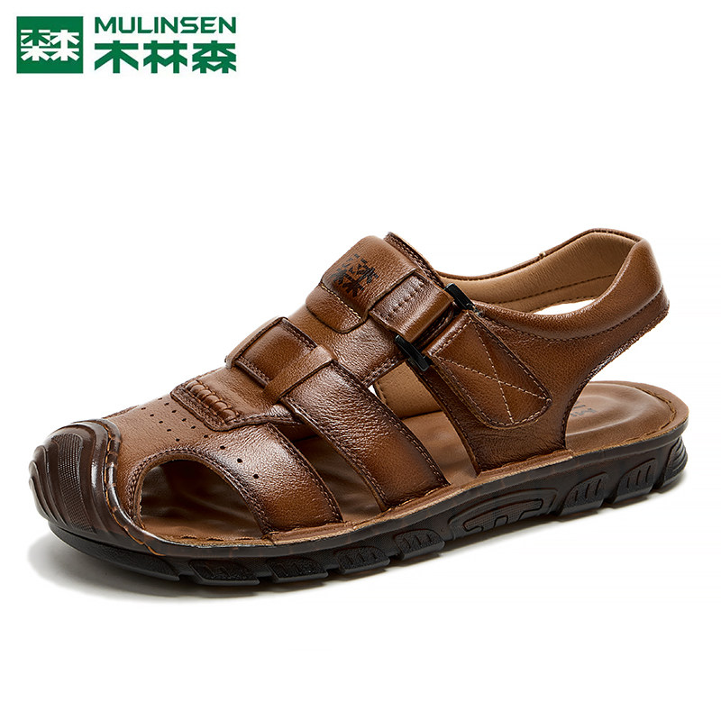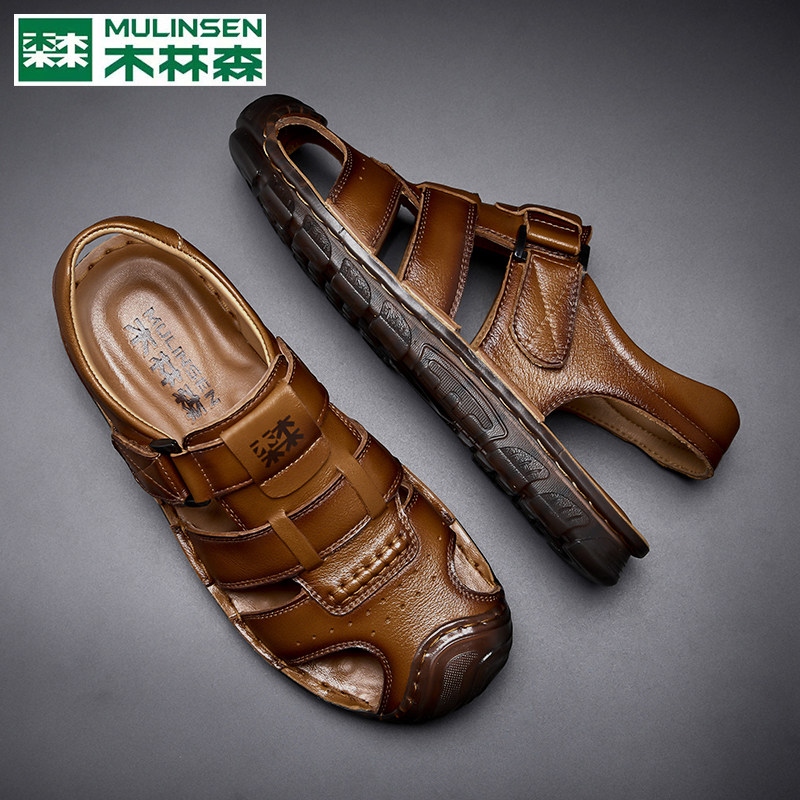 木林森凉鞋男夏季头层牛皮沙滩鞋