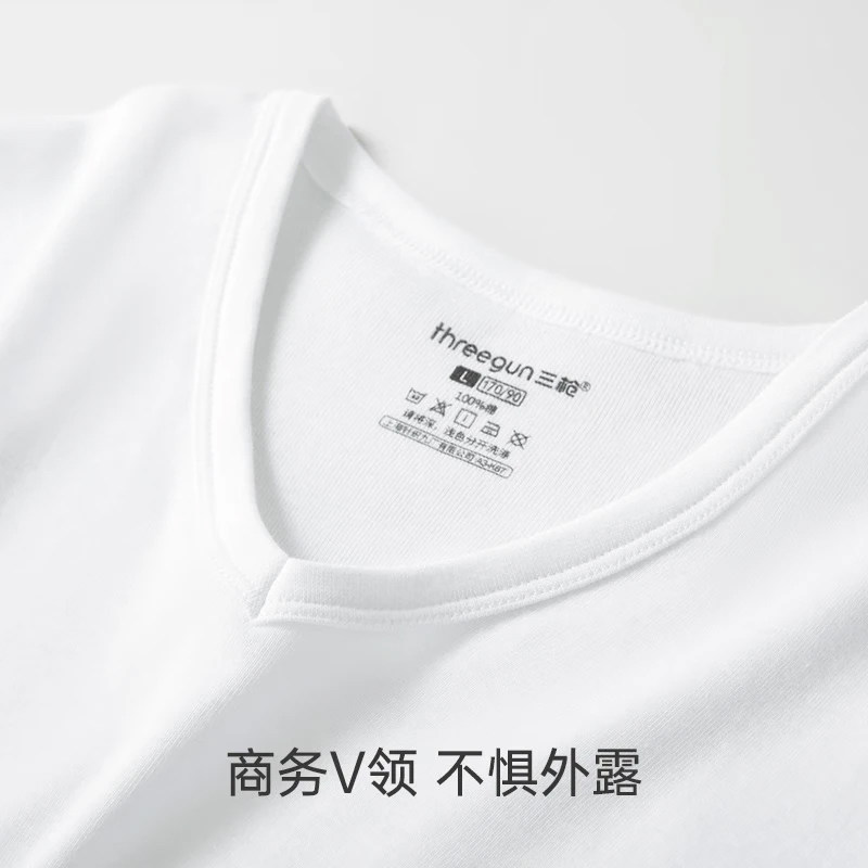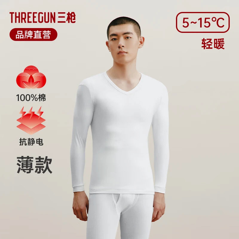 三枪100%纯棉男士薄款保暖内衣套装全棉V领青年打底白色秋衣秋裤