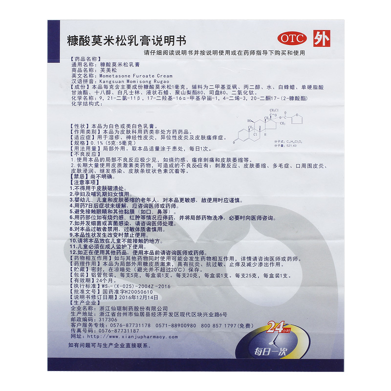 【仙琚】糠酸莫米松乳膏0.1%*20g*1支/盒神经性皮炎湿疹皮肤瘙痒症瘙痒止痒