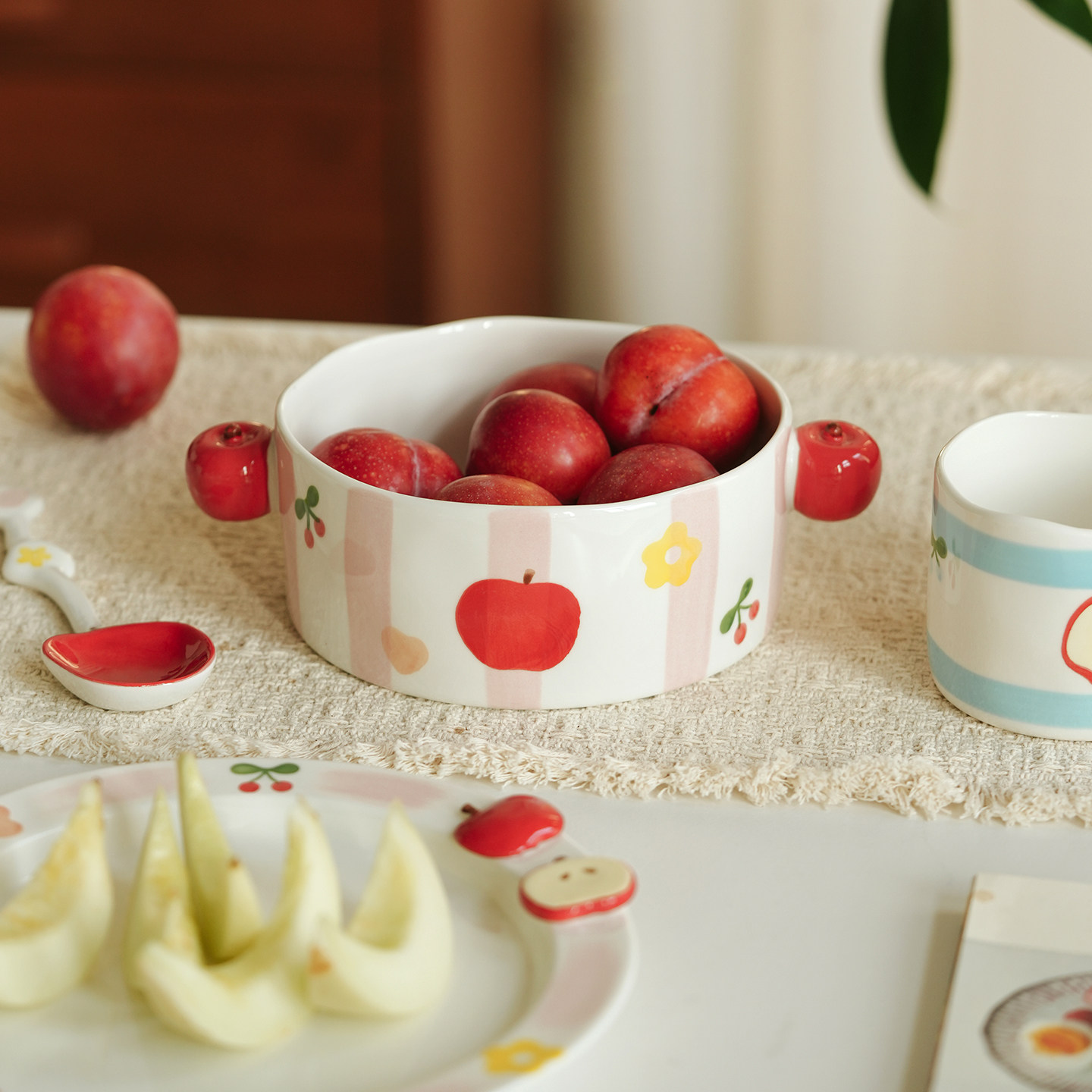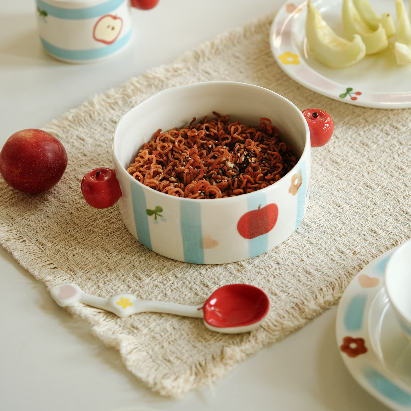 可爱苹果餐具套装家用釉下彩陶瓷勺吃饭碗咖啡杯碟马克杯水果盘子