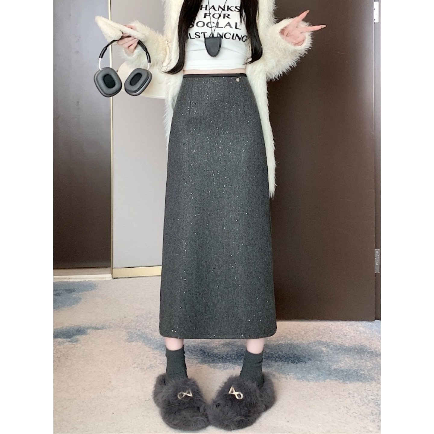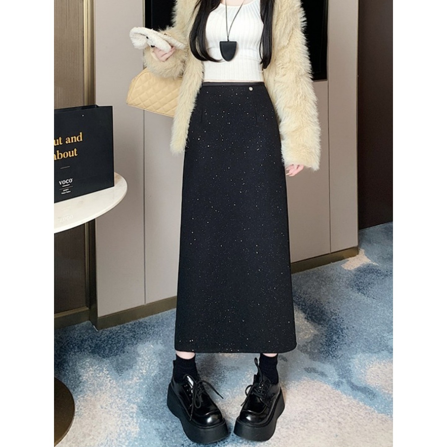 大码法式闪闪亮片毛呢短裙女秋冬新款御姐风A字裙高腰呢子半身裙