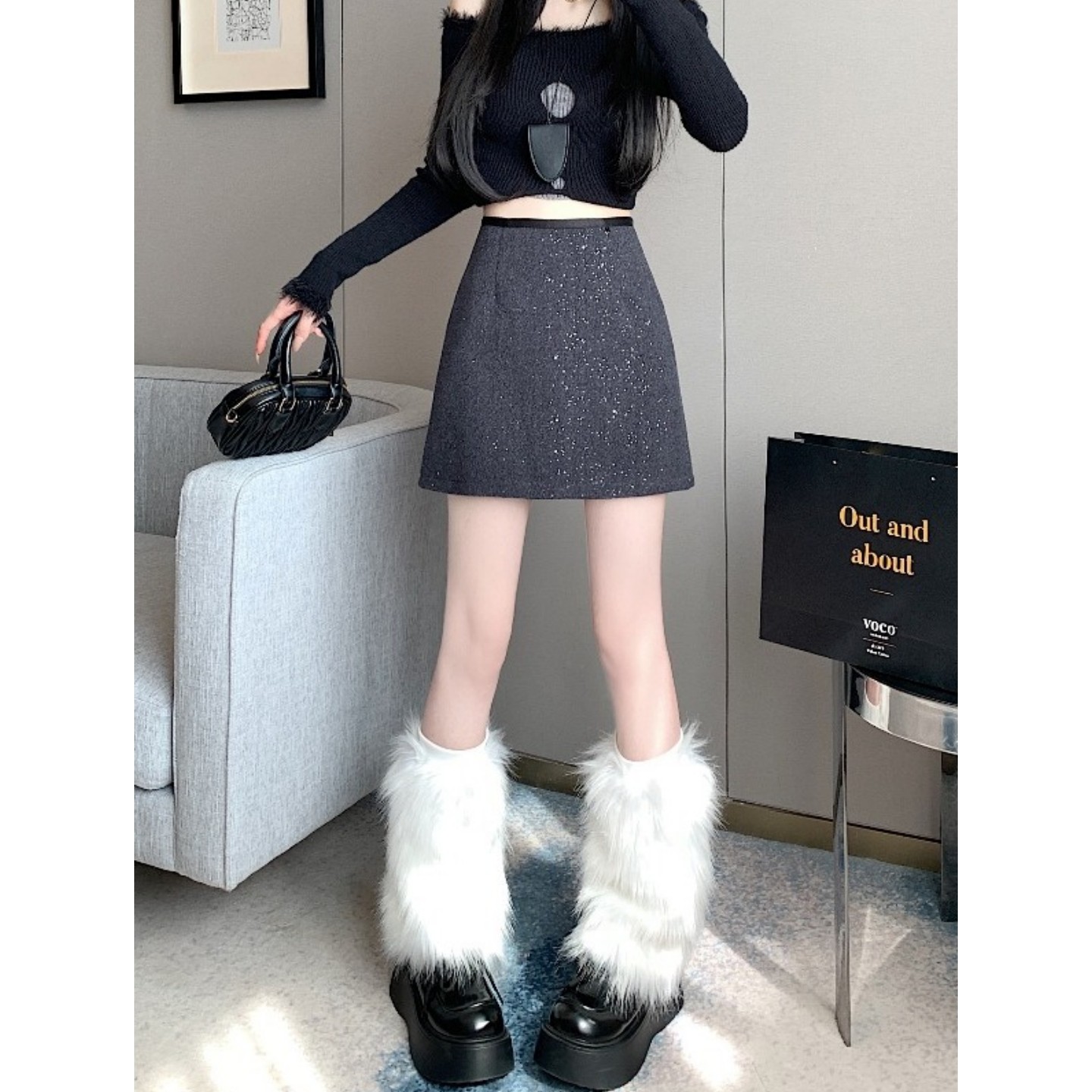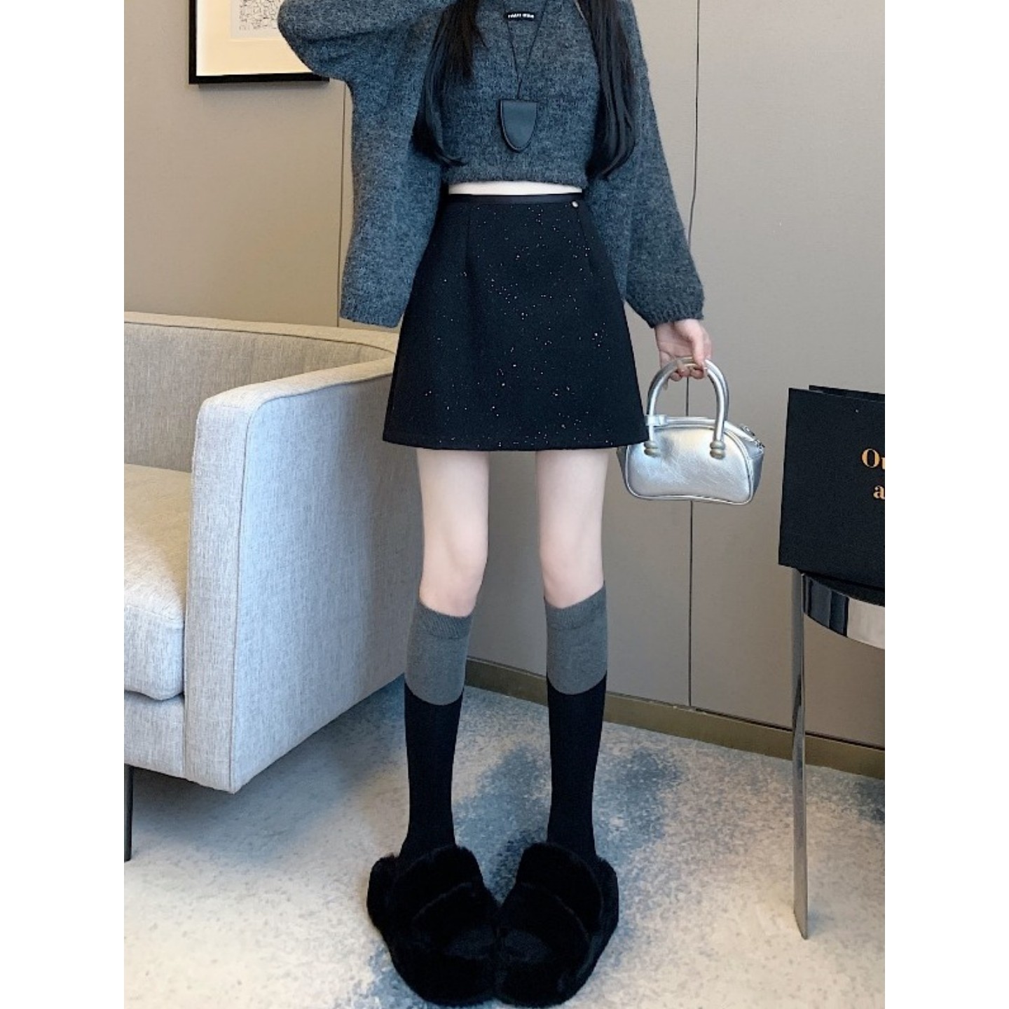 大码法式闪闪亮片毛呢短裙女秋冬