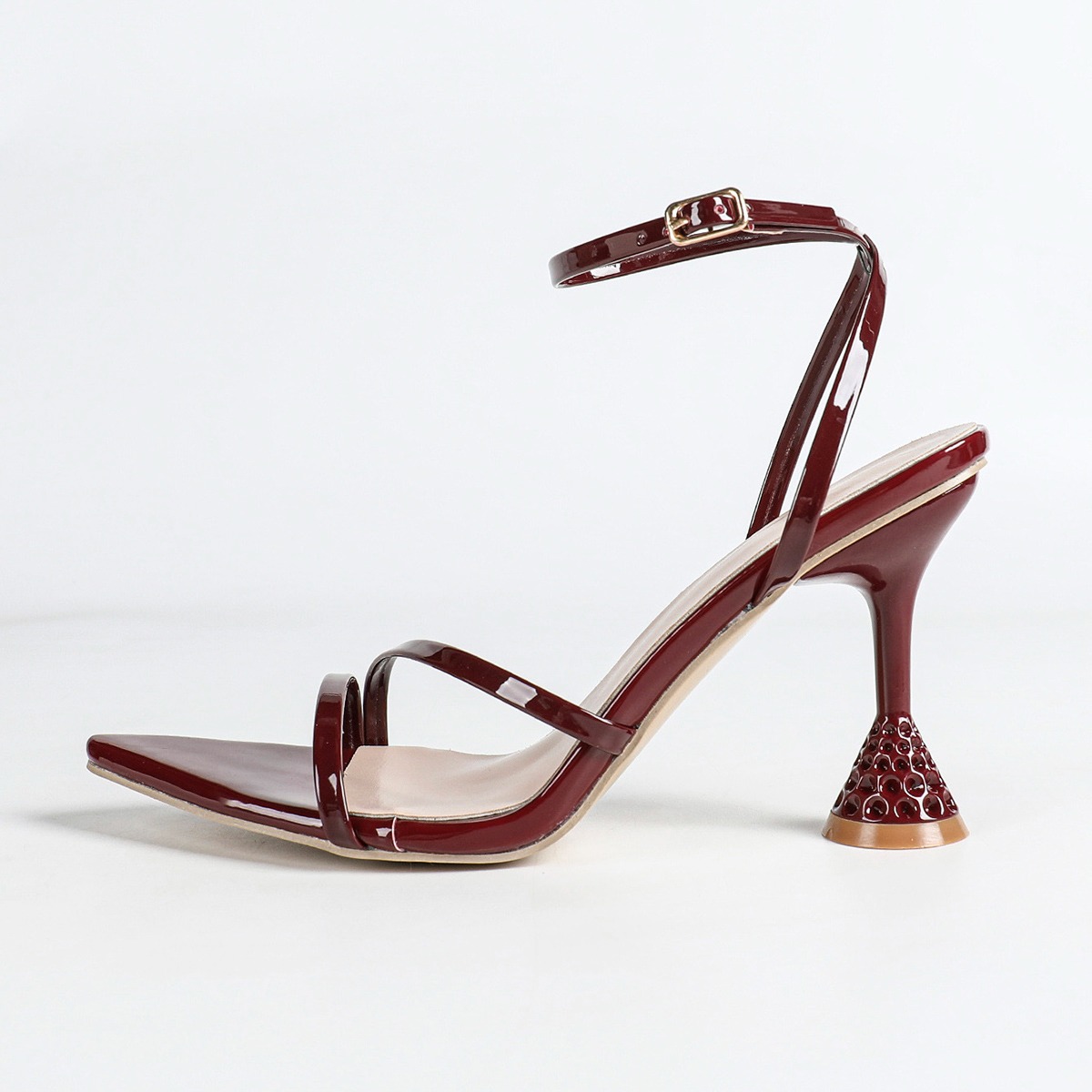 时尚欧美风露趾凉鞋女性感酒红色细带礼服鞋一字带时尚气质高跟鞋