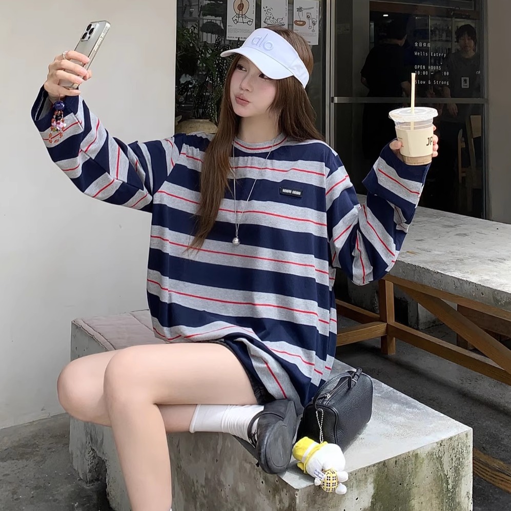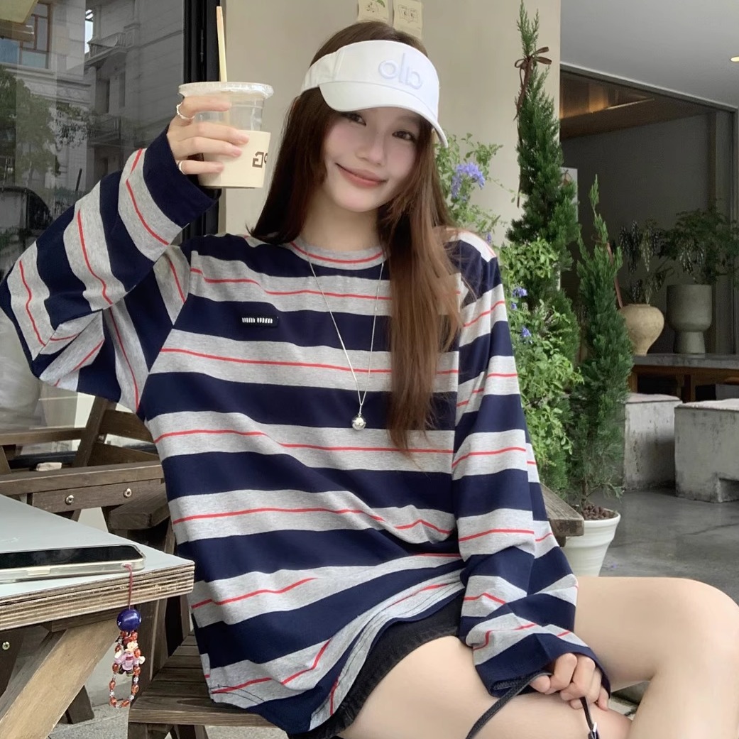 韩系圆领条纹撞色设计感纯棉打底衫女2025秋新款宽松休闲百搭长袖